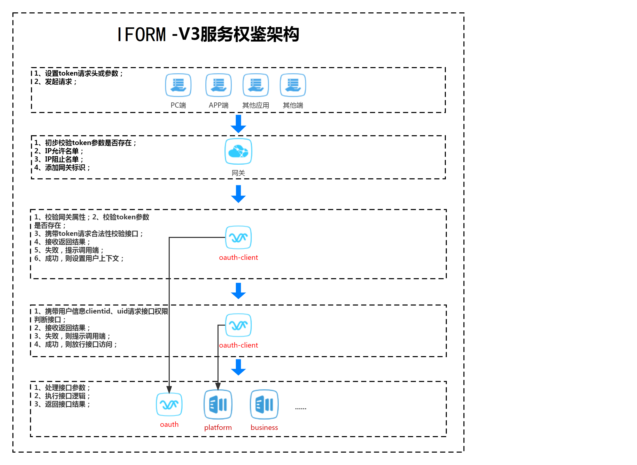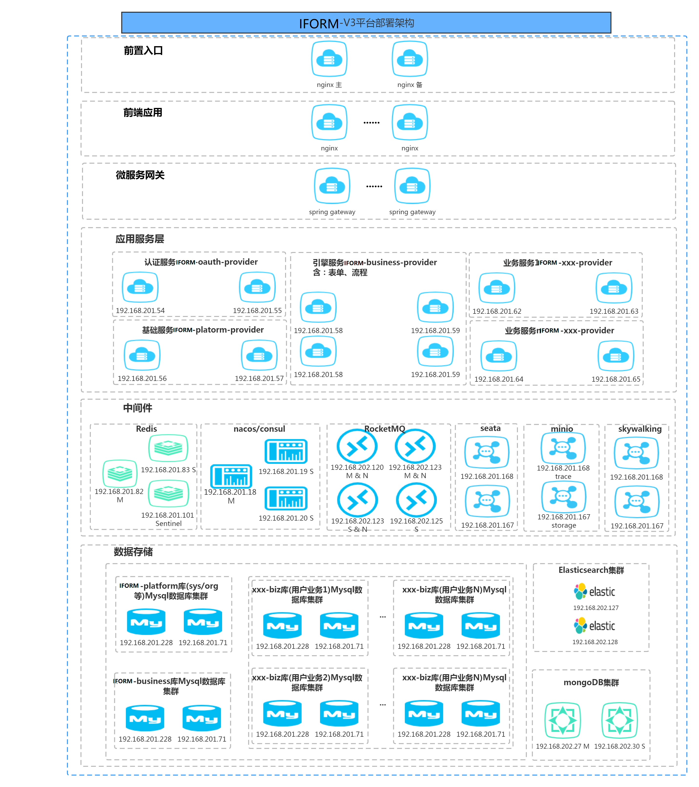 目录 搜索 展开 文档说明技术栈介绍架构介绍全局请求说明前端开发文档前端培训大纲技术选型前端相关知识及相关框架JavaScript 基础知识Chrome DevTools 面板全攻略!!!Flex布局语法教程如何调试代码开发规范(风格指南)【必看】ESLint前端风格指南IFORM平台开发目录结构快速上手开发典型页面平台开发指导通用组件业务组件选择器数据字典上传附件自动编号自定义对话框关联数据流程组件流程图审批历史插件错误捕捉日志控制台打印优化密码加密VUEXaccountdbfullscreengraylogmenupagereleasessearchsizethemetransitionuauser常量和静态配置 多页面路由权限控制管理异步请求数据持久化CSS 实用类Utils 实用工具utils.jscookies.jsaction.jstree.jsvalidate.jsfecha.js通用过滤器(filters)通用指令(directives)vue-cli 和 webpack 配置mock开发二次开发指导【重点】表单脚本【重点】数据模版脚本API接口请求配置动态数据功能配置【数据模版】查询条件的js脚本范例支持第三方接口开发指导URL表单解决方案桌面栏目开发指导【表单管理】生成zip代码包链接脚本【不推荐使用】构建、发布和部署构建与发布生产部署FAQ【重要说明】如何更新版本【最新版本】如何修改公司LOGO和公司名称信息平台类FAQIFORM平台菜单如何添加表单、数据模版、报表等IFORM平台如何自定义样式主题IFORM平台如何增加/替换图标IFORM平台默认的按钮说明IFORM平台按钮权限配置说明IFORM平台的布局方式IFORM平台前端如何集成单点登录方案(前端)IFORM平台如何添加前端路由IFORM平台消息链接处理表单类FAQIFORM平台表单自定义classIFORM平台自定义组件(控件)字段IFORM平台多级子表【孙表】解决方案IFORM平台iframe外部表单IFORM平台子表单列表分组配置说明IFORM平台表单打印特殊字符无法显示IFORM平台表单如何添加一个新的控件平台优化类FAQIFORM平台如何提升页面打开速度IFORM平台前端请求排队或停止阻塞解决办法IFORM平台浏览器每个域名6个并发请求限制解决方案IFORM平台前端打包内存溢出问题解决IFORM平台解决 IE版本兼容其他类FAQIFORM平台平台登录权限疑问IFORM平台数据模板查询过滤数据列表信息IFORM平台如何传递参数到表单信息页面IFORM平台消息模板设置及使用流程IFORM平台生成代码的后端联调漏洞类FAQ检测到目标站点存在javascript框架库漏洞HTTP响应头漏洞敏感信息泄露或ip地址泄漏常见问题VUE开发相关问题汇总修改 ESLint 规则浏览器兼容版本扩展阅读提问的智慧跨域问题解决方案字体图标带你封装一个vue componentSVN代码提交VSCode使用svn代码管理工具跨浏览器窗体消息通讯本地项目模拟域名调试单点登录基于vue-cli项目打包慢的定位优化过程前端到底用nginx来做啥关于 this 指向管理多个node.js版本工具移动端开发文档构建、发布和部署打包成APP封装成小程序后端开发文档开发规范代码目录文件说明代码层次调用说明业务模块目录结构数据库建表规范国际化key规范二开注意重要事项二次开发指导如何在新的模块集成websocket服务禁用RabbitMQ自启动集成单点登录(后端)IFORM认证服务实现原理IFORM登录服务实现原理其他系统如何使用IFORM认证登陆-接入端其他系统如何使用IFORM认证登录-服务端流程引擎事件处理器开始和结束事件脚本节点前后置处理器节点前后置事件脚本流程用户-脚本计算流程定义相关表有哪些如何添加新的消息类型?添加流程按钮添加流程用户插件文件存储如何支持minio文件上传如何支持ftp文件存储Groovy脚本自定义脚本开发范例工具类说明ActionCmdBpmDelegateTaskMybatisTemplateProviderJdbcScriptBpmnScriptBusinessScriptCommonScriptThridServiceScriptValidationScriptContextUtil服务接口文档认证服务接口用户接口文档授权码接口文档认证接口文档注册接口文档基础服务接口组织管理员工管理1员工管理2用户管理参与者管理用户组管理角色管理组织管理岗位管理常量管理参与者属性管理参与者选项管理等级管理租户管理分级管理参与者等级管理选择器选择器-岗位相关选择器-用户相关选择器-用户组相关选择器-组织相关选择器-角色相关系统管理流程服务接口工作流程流程定义管理流程节点配置流程实例管理可视化设计器流程系统常量流程任务管理表单服务接口业务对象管理表单管理数据集管理数据模版管理组件调用文档文件组件文档消息队列(MQ)文档短信(阿里.云通信)文档微信推送文档邮件组件文档内部消息组件文档缓存组件文档流程引擎(Activiti)文档-FeignClient流程引擎(Activiti)文档-Local分布式事务示例使用文档FAQ如何开启数据日志记录开启数据日志配置如何在业务中支持数据日志前端如何构造数据列表的复杂查询?QueryFilter如何构造复杂的where条件子句?使用缓存时如何解决第一次和第二次查询数据不一致如何禁用对应缓存(一级二级)如何使用j2cache进行缓存开发后端部署文档maven setting设置工程启动介绍(微服务)工程启动介绍(单体)idea开发环境-启动配置项目性能优化性能问题收集性能优化流程 暂无相关搜索结果! 阅读次数:1020 本文档使用 MinDoc 发布 架构介绍 一、IFORM-V3微服务架构图二、IFORM-V3微服务代码层次三、IFORM-V3服务权鉴架构四、IFORM-V3服务部署架构一、IFORM-V3微服务架构图二、IFORM-V3微服务代码层次三、IFORM-V3服务权鉴架构四、IFORM-V3服务部署架构作者:管理员 创建时间:2023-12-20 11:14最后编辑:hugh 更新时间:2025-11-04 15:32