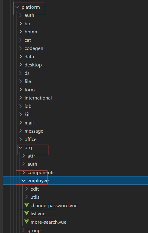 对应的实际页面:views/platform/org/employee/list ,前面的views写死代码里面