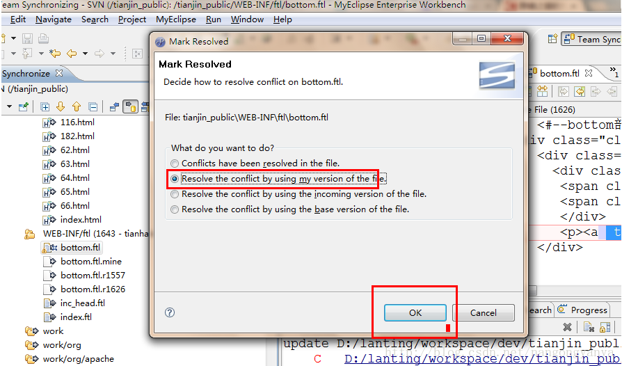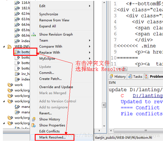 2、我们通过手动处理源文件,修改得到自己真实想要上传到svn的文件后。右击Team->标记为解决(Mark as Merged)。默认选择第一个“标记为冲突解决”,点击OK。刚才的三个文件将消失,剩下自己的源文件。