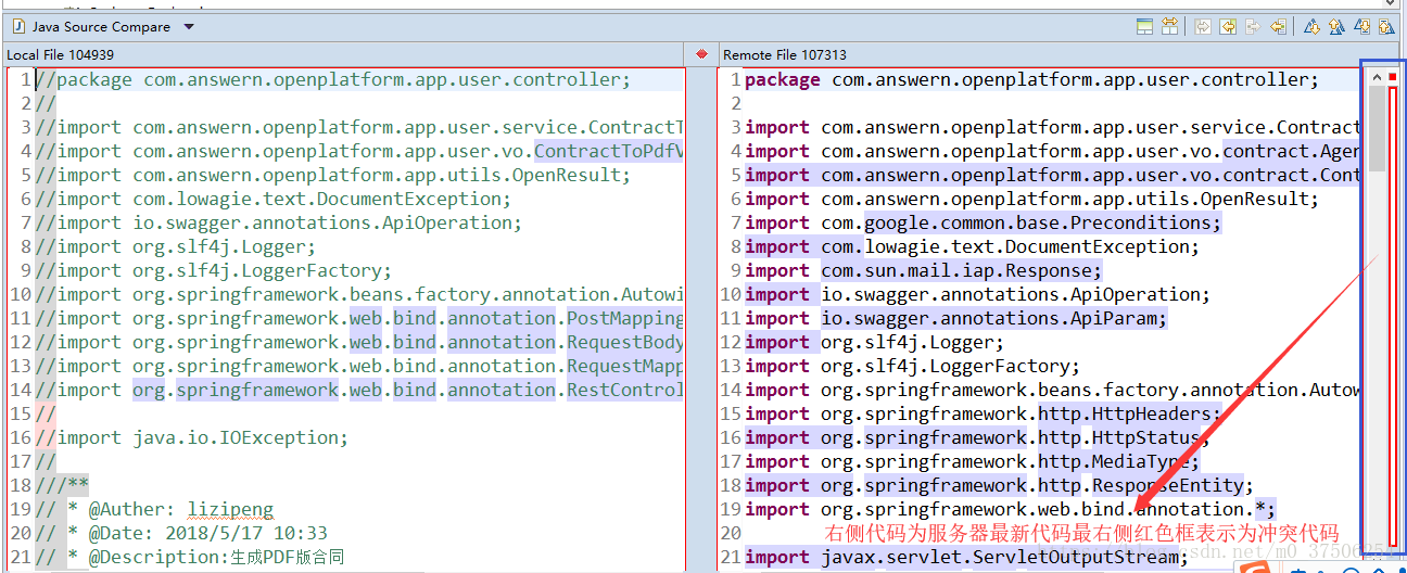 上面的例子应该能看懂左侧代码为自己的代码观察发现被自己注释掉了所以可以对比代码是否是最新,如果本地代码不是最新可以将右侧代码复制到右侧保存,最后右击冲突文件点击标记为合并即可。