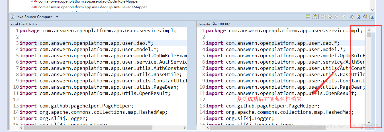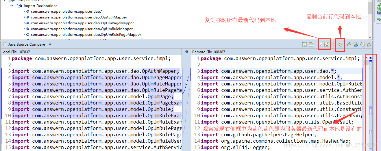 2、找到服务器上新增的但本地没有的代码块,选中此代码块,点击右上角的按钮(如下图箭头指向的按钮)将服务器代码复制到本地(其他地方也同此操作),如果点击按钮没用,则关闭比较视图重新打开