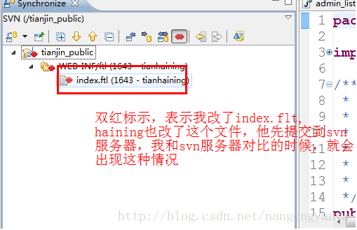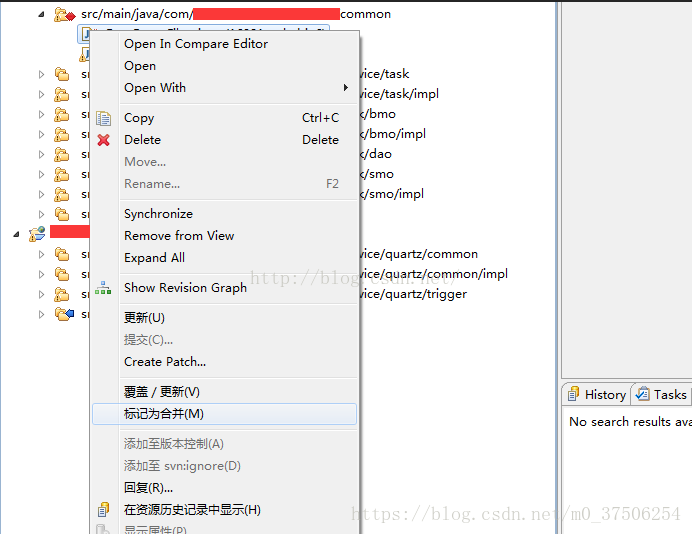 3.如果显示有冲突(你没有改动过该代码哦)将所有服务器上新增的代码复制到本地文件后,右键冲突文件选择标记为合并即可,此时该文件就会消失在Synchronize视图下,并且该文件的代码已经成功将本地代码和远程代码合并到一起.
