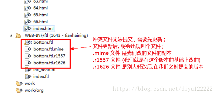 1、如果出现冲突会多出三个文件,分别是:“.mine”“r(xxx+1)”“r(xxx)”其中xxx为版本号。“.mine”是我要提交的文件,“.r(xxx)”是我是在这个版本文件基础上修改后产生冲突的。“r(xxx+1)”是目前svn服务器最新版本的内容是这样。