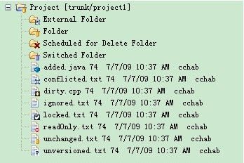 一个新检出的工作复本使用绿色的勾做重载。表示Subversion状态 正常。 |