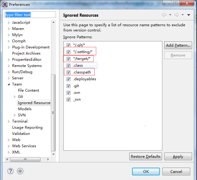 在eclipse工具栏上window->Prefernces->Team->Ignored Resource