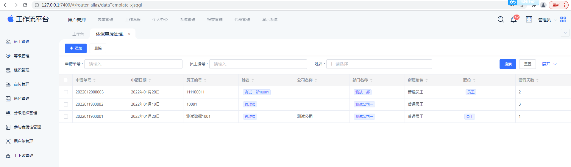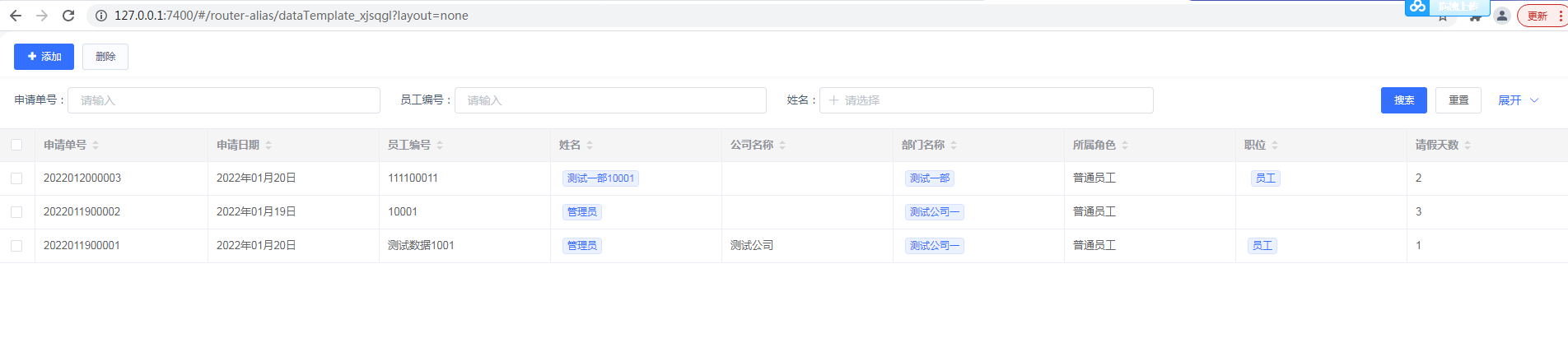 最终组合菜单地址如:http://127.0.0.1:7400/#/router-alias/dataTemplate_xjsqgl ,将此地址直接输入浏览器访问效果如下图: