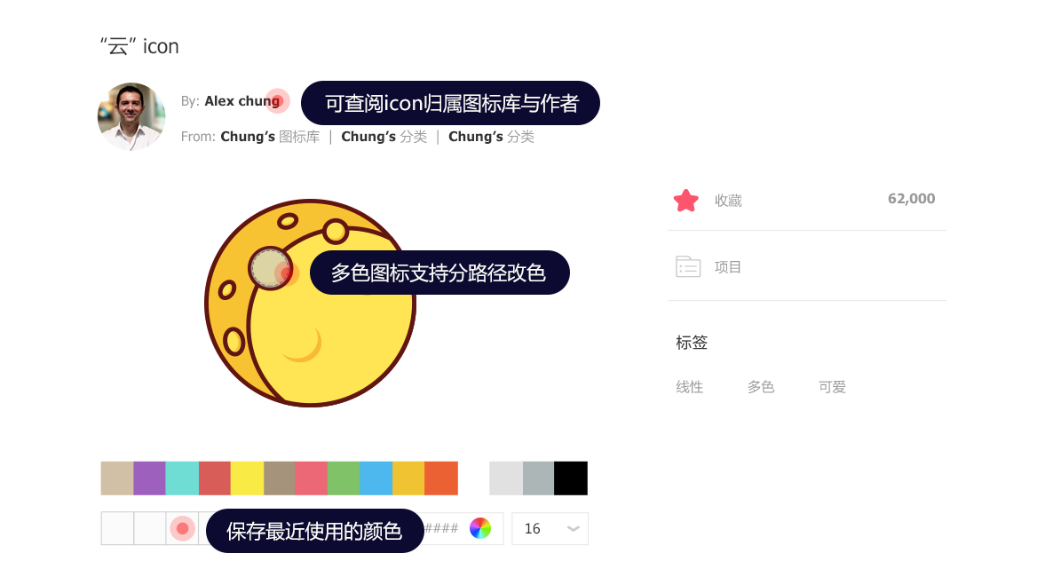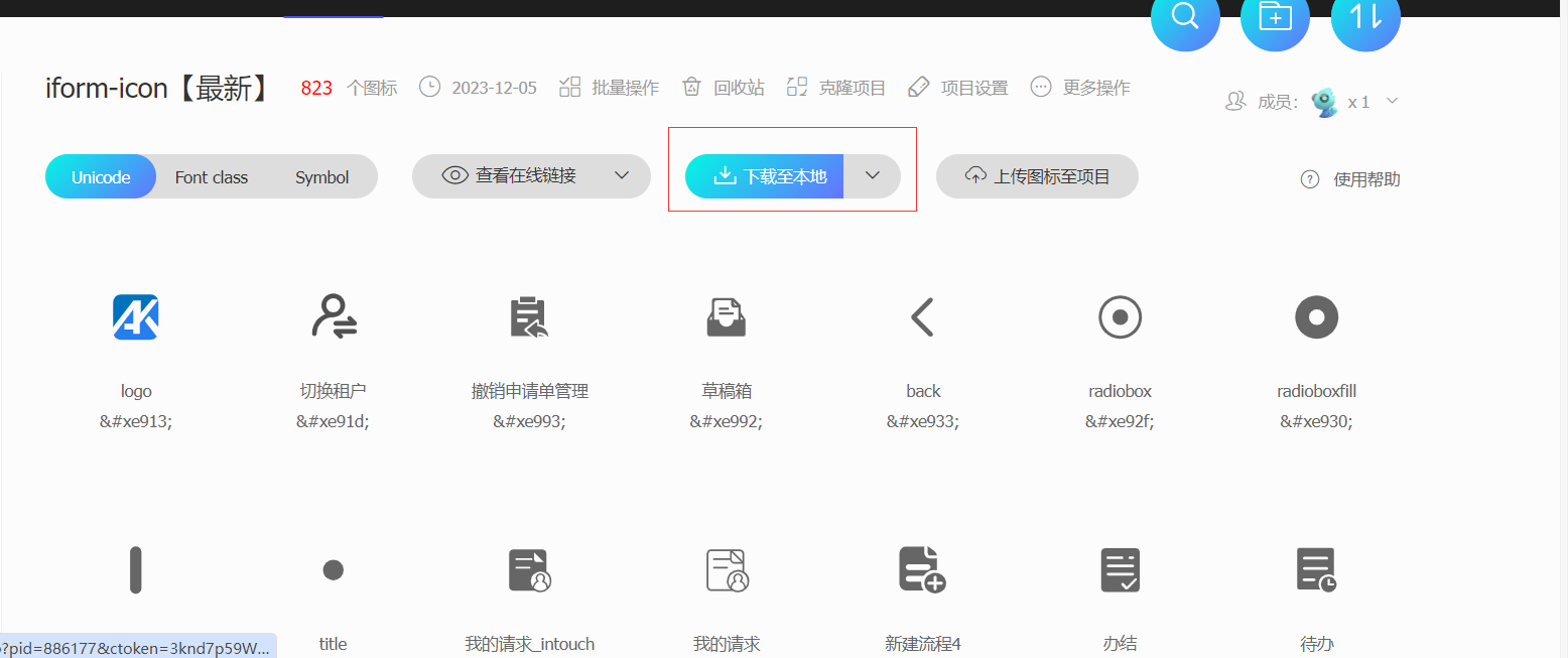 - 但是因为是字体,所以不支持多色。只能使用平台里单色的图标,就算项目里有多色图标也会自动去色。