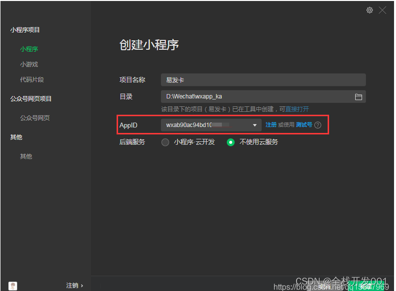 2、微信开发者工具中创建小程序,填写前面注册小程序的AppID