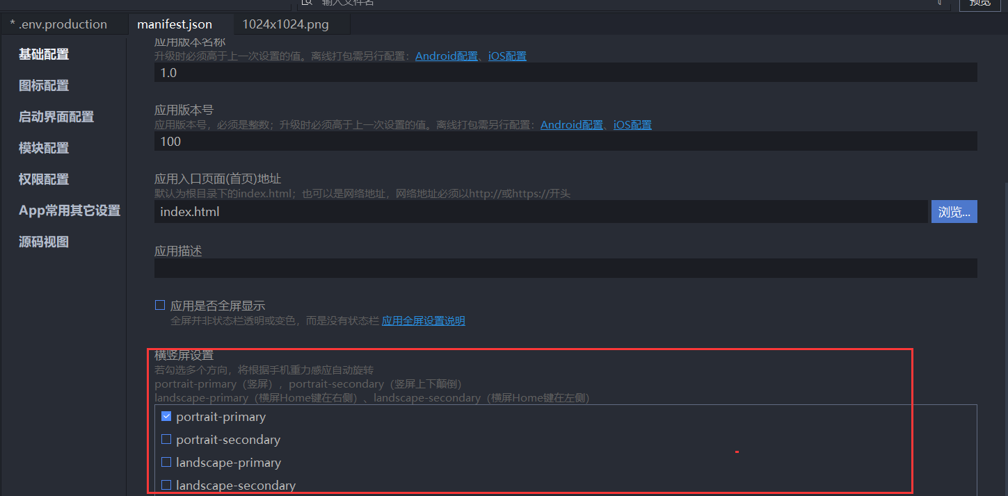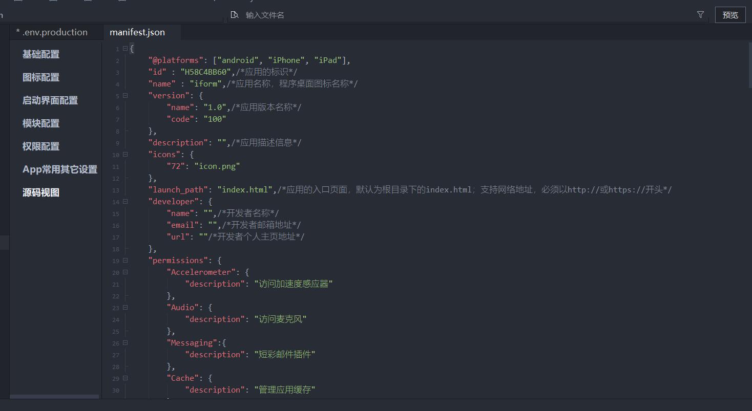 Manifest.json文件是5+移动App的配置文件,用于指定应用的显示名称、图标、应用入口文件地址及需要使用的设备权限等信息,用户可通过HBuilder的可视化界面视图或者源码视图来配置5+移动App的信息。