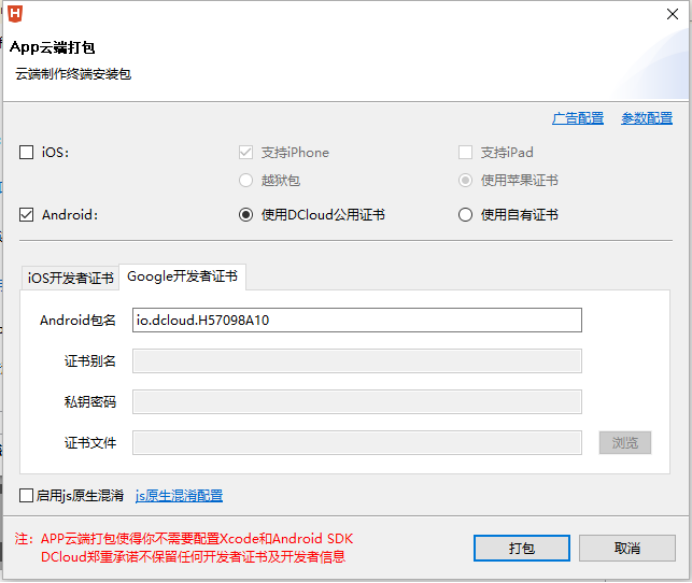 选择iOS打包,支持的设备类型(可以选择支持iPhone和支持ipad),选择越狱包(会默认选DCloud公用证书)。