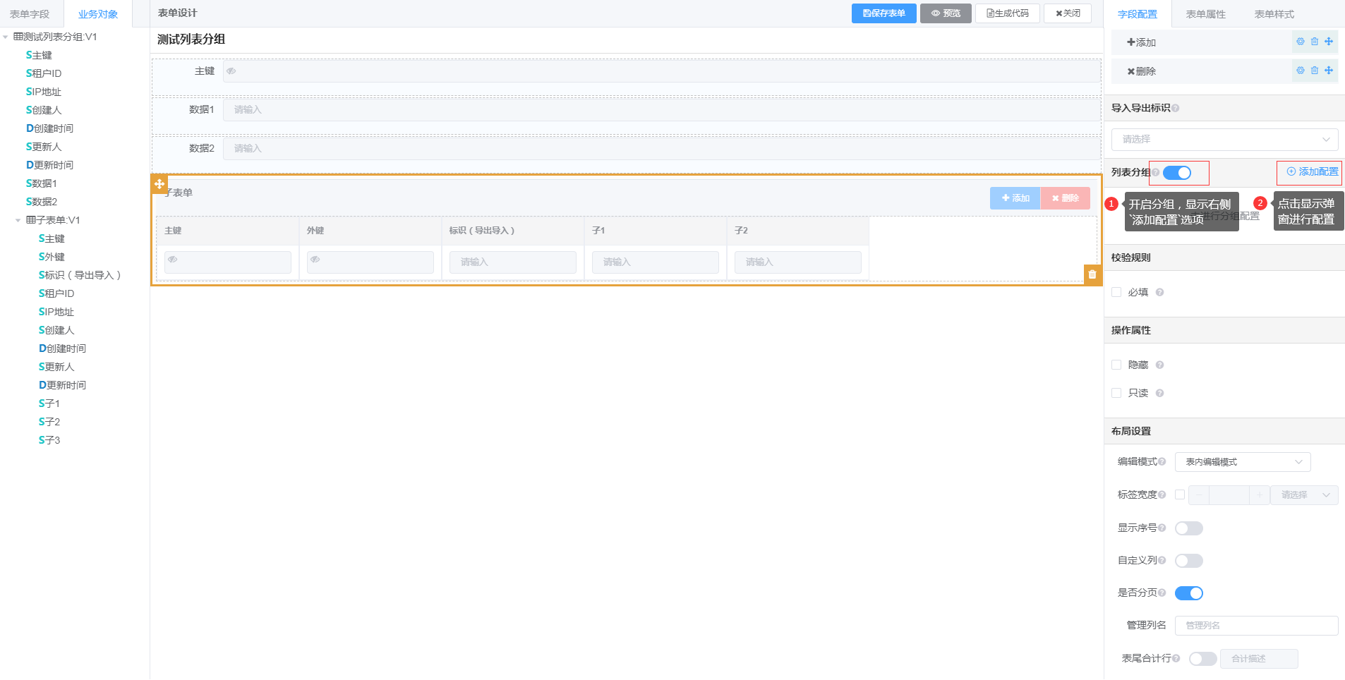 具体配置位置:【子表单】控件-【字段配置】-【列表分组】。