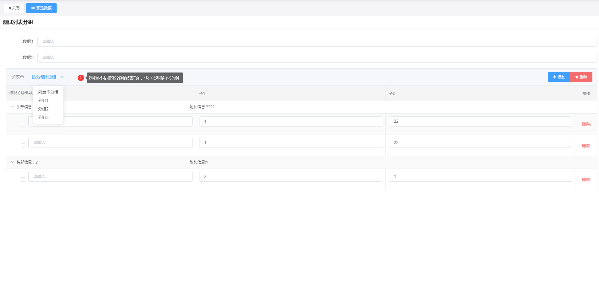 6.配置完成后在预览中进行查看,如果存在分组配置,则显示配置的下拉列表,且在编辑状态时,默认选择不分组选项,在只读状态时选择分组配置数组中的第一个配置
