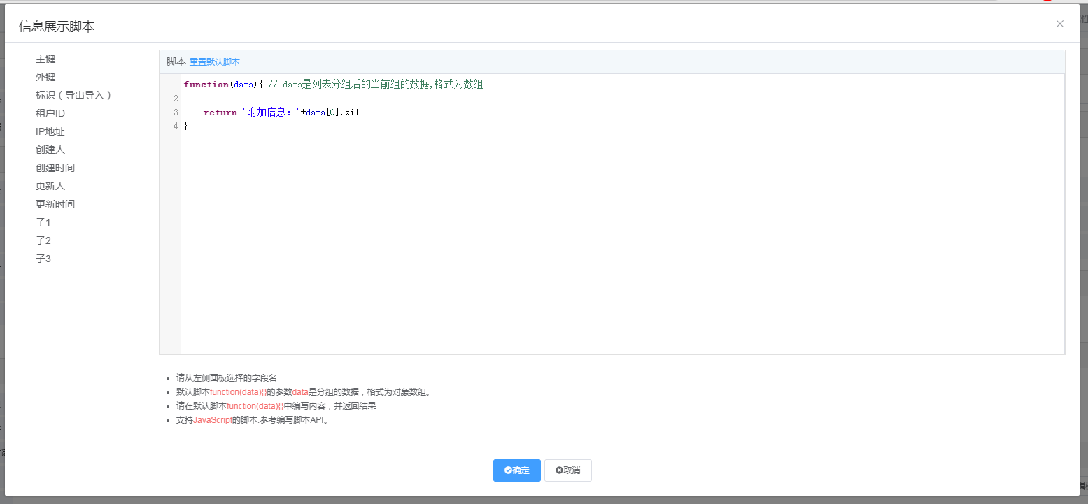 2)脚本弹窗显示(需在默认的脚本函数中进行编辑,且需返回结果,函数传入的参数’data’为当前分组的对象数组数据)