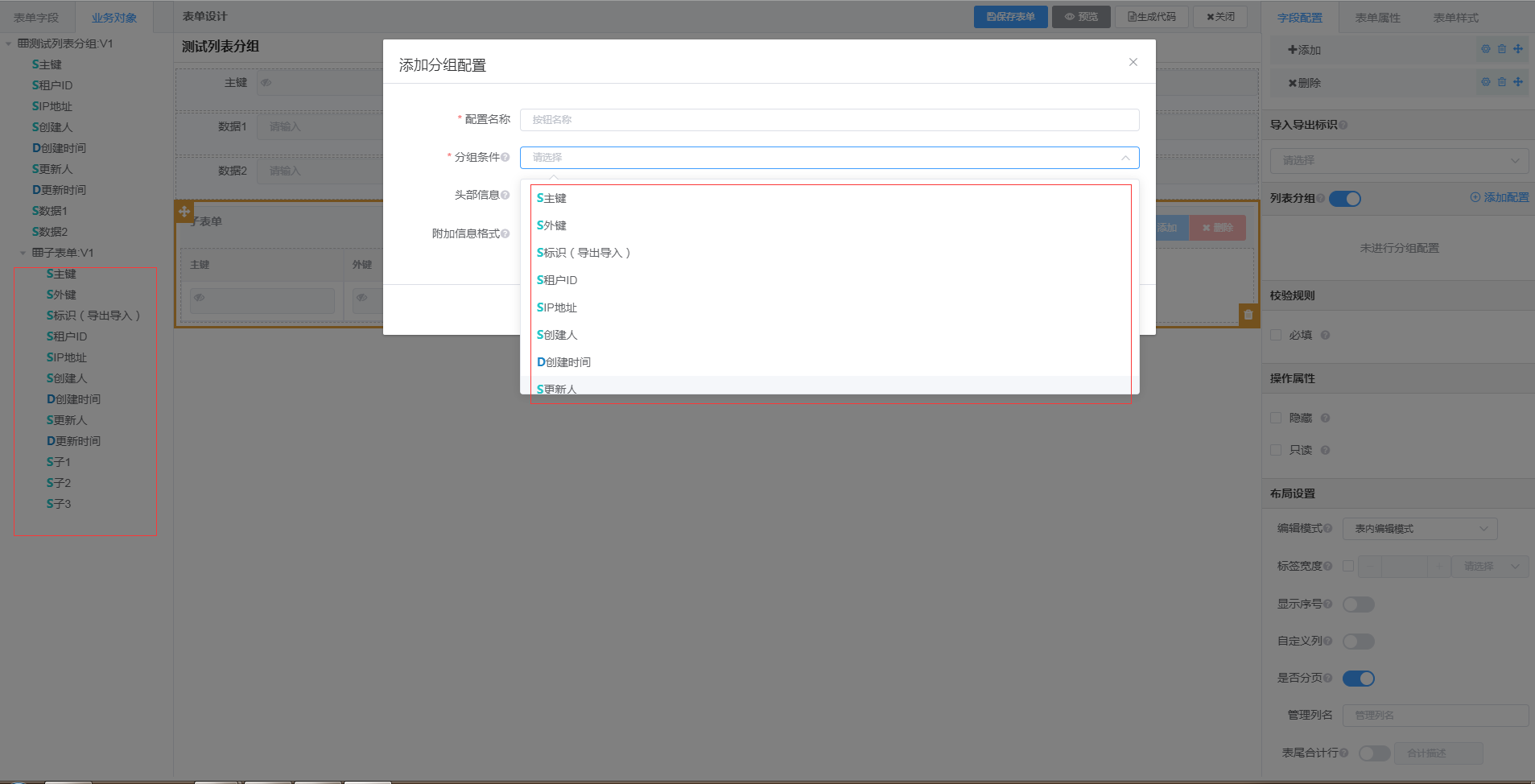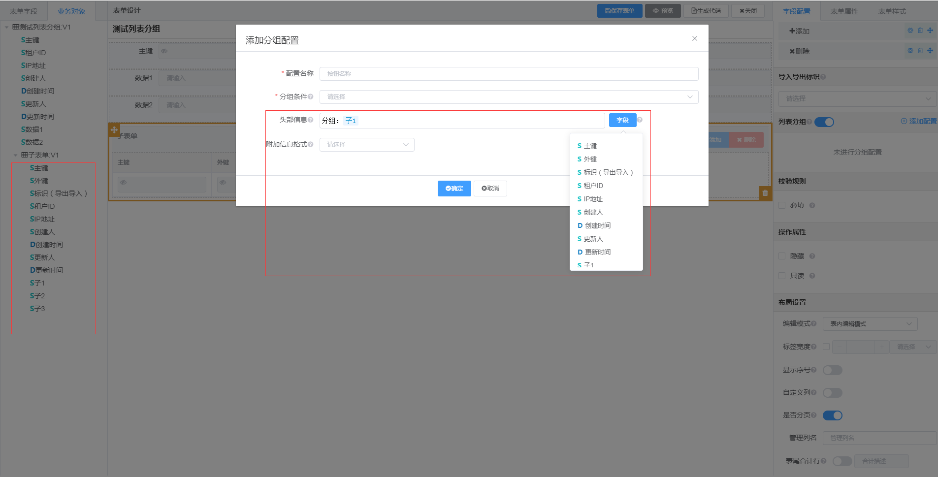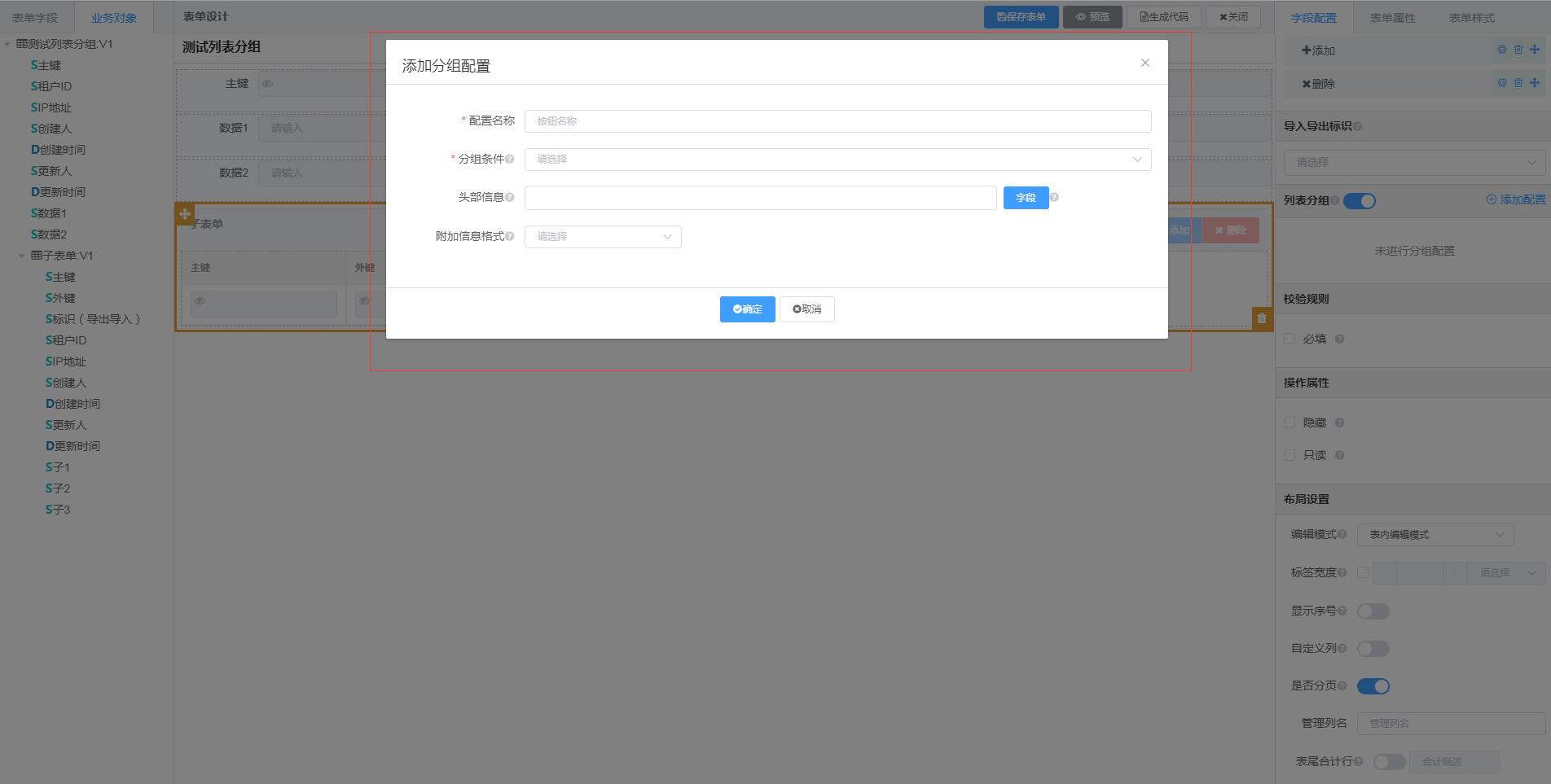 4.新增分组配置-显示分组配置控件弹窗,需传入当前子表单的业务对象字段,并且配置名称(该配置的名称描述)与分组条件(分组的依据条件)是必填项