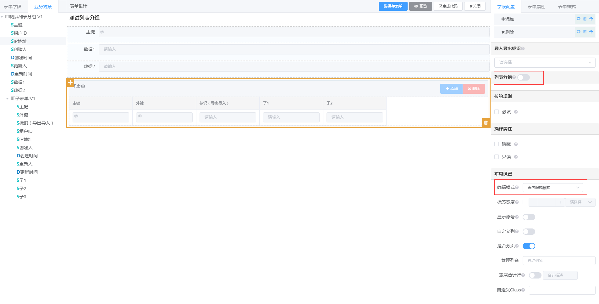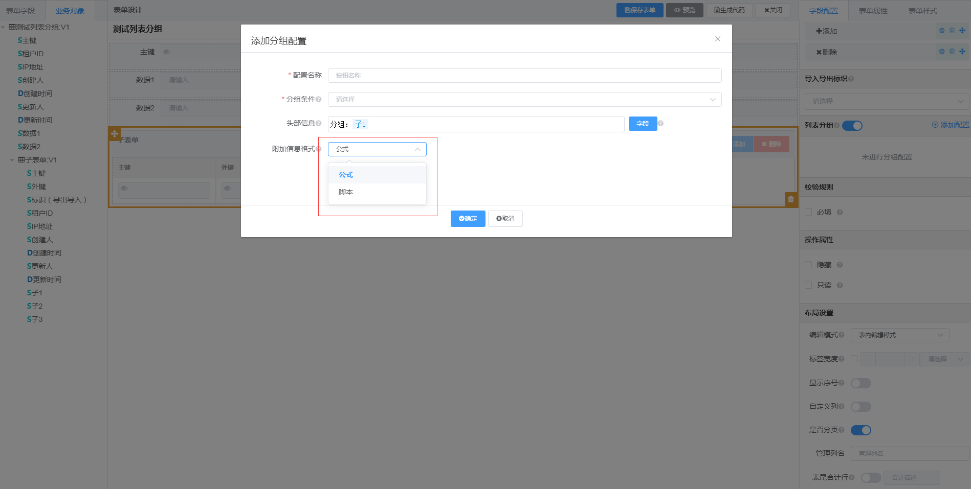 2.选择子表单控件,在字段配置-布局设置-编辑模式选择表内编辑模式或者弹窗模式时,显示列表分组部分的配置