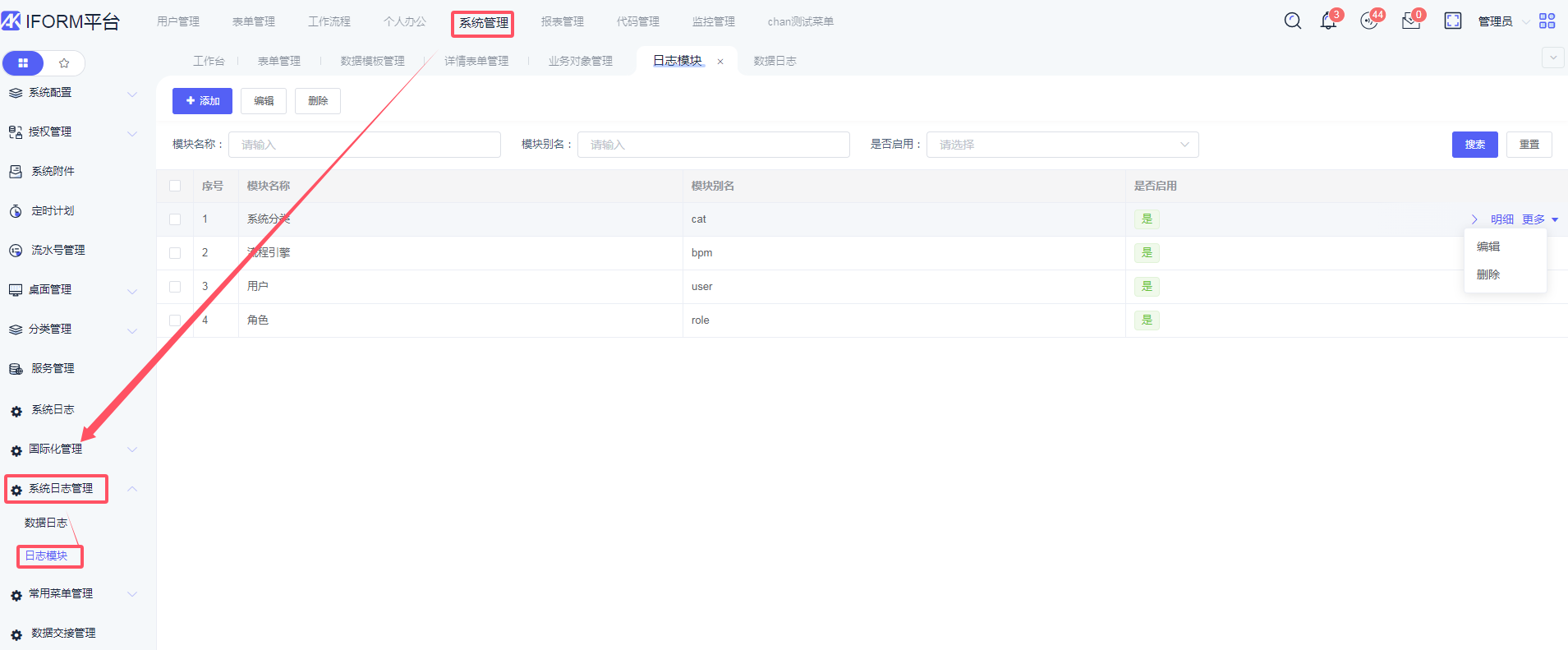 需要将系统部署成功登录系统后,选择系统管理–系统日志管理–日志模块进行“编辑”修改”是否启用”,如下图: