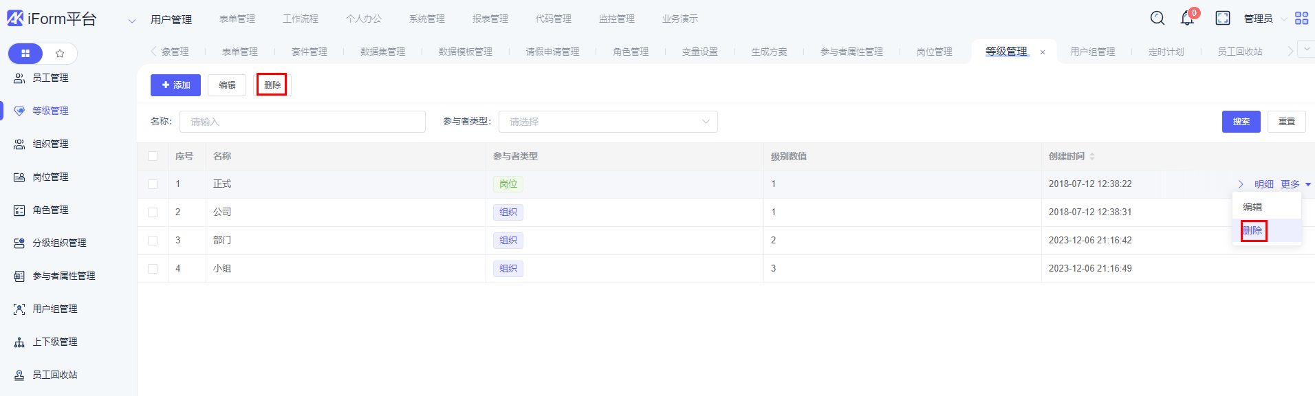 方便岗位、组织划分等级维度,从而实现多维度查询岗位、组织信息,支持增、删、改、查。