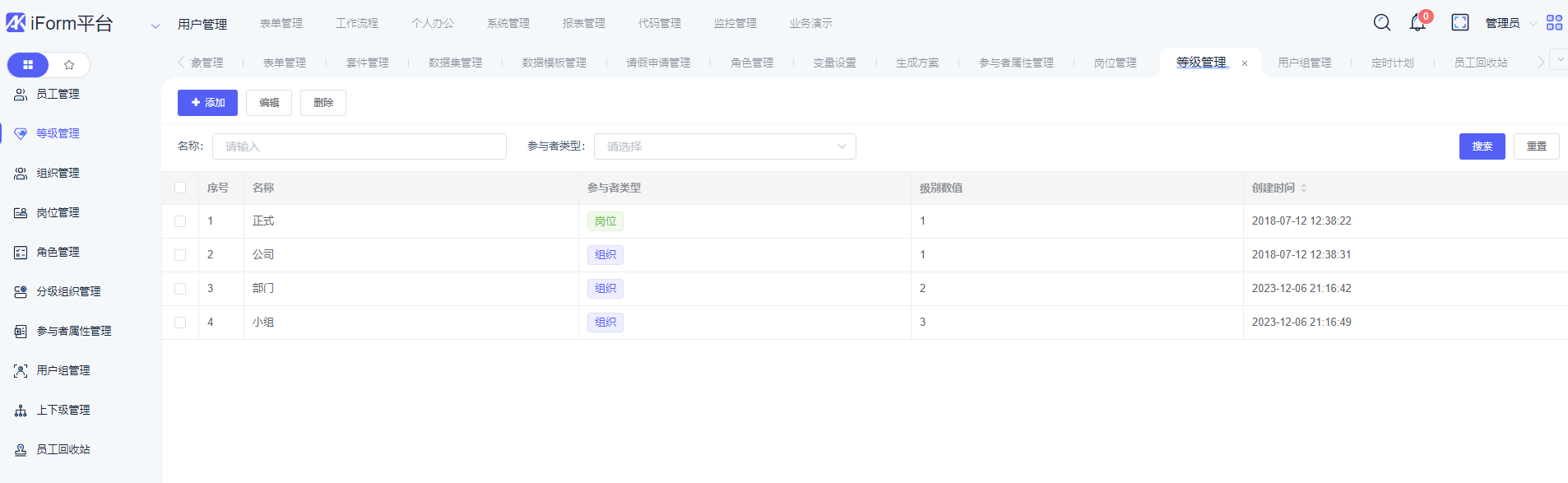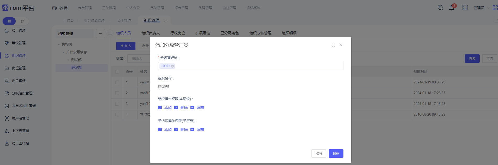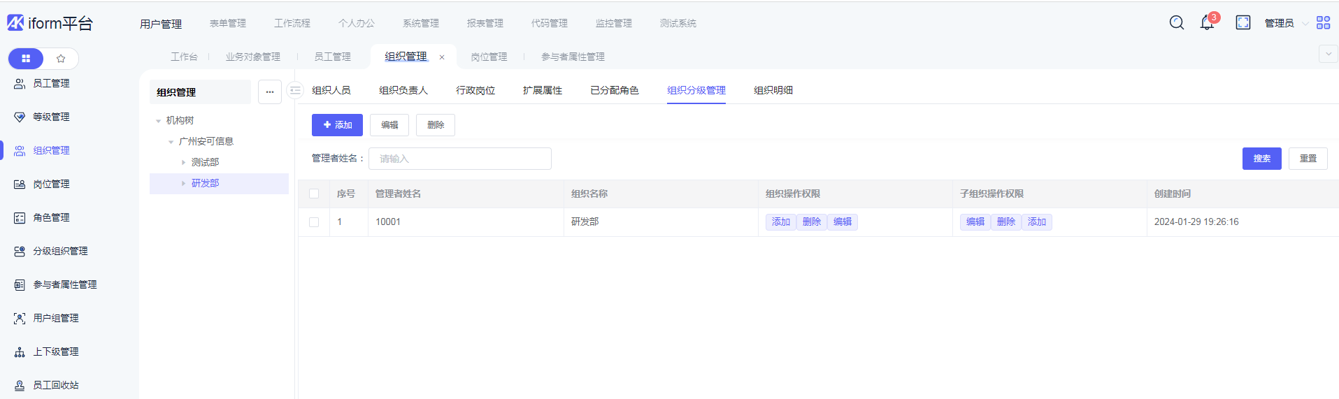 选中“组织分级管理”,对应将“添加组织分级管理员”的信息进行统一管理维护,可进行增、删、改、查: