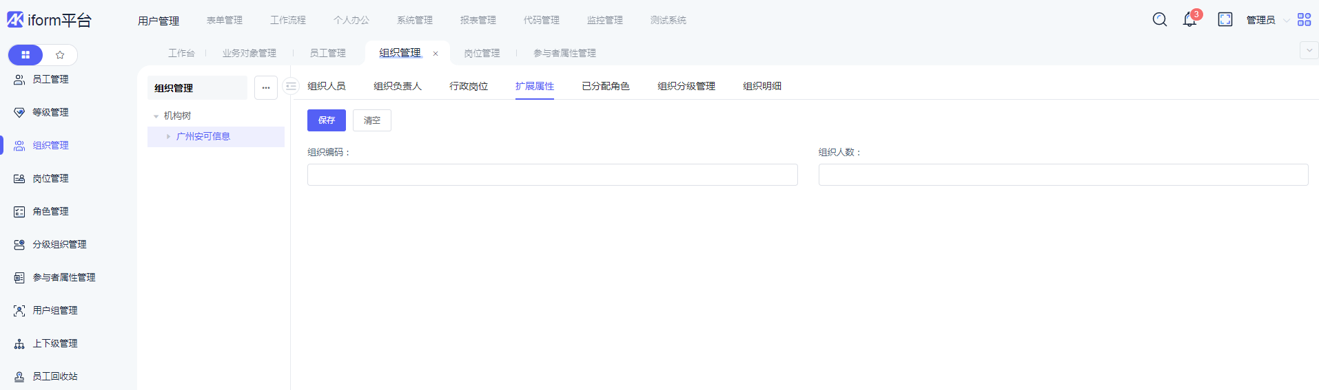 选中“扩展属性”,则此扩展属性需先在「用户管理 >> 参与者属性管理>>有增加对应组织的扩展属性信息」,此处根据业务个性可增加对应的业务属性内容,比如:组织编码,组织人数等:
