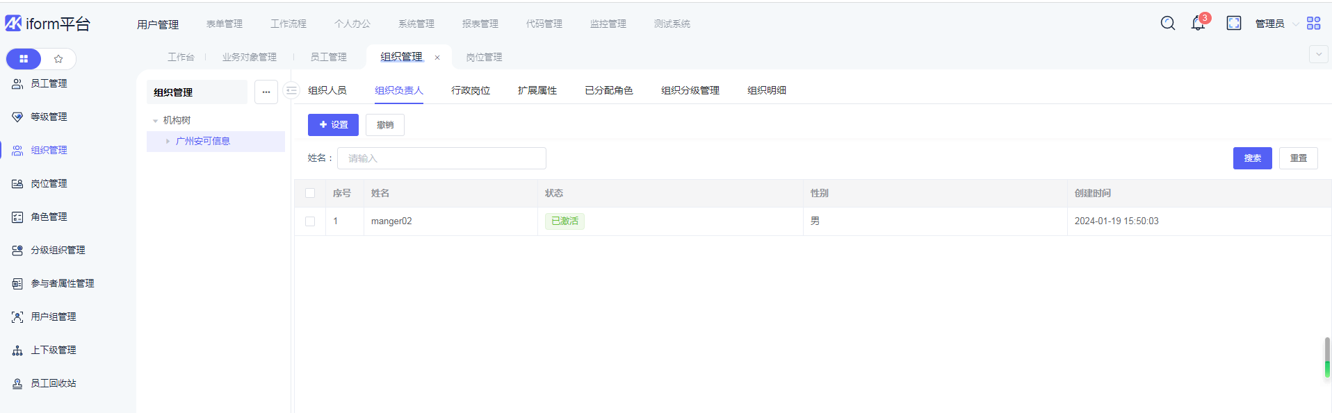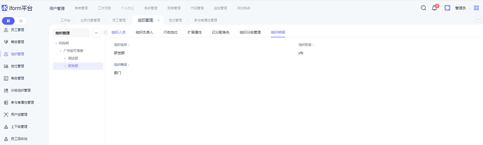 设置组织架构树的基本信息,可设置子组织的分级管理员以及增、删、改、移动节点、节点排序对组织管理进行调整,还可添加组织下维护的岗位、角色方便实现进入该组织便可拥有该组织粒度的菜单按钮权限。