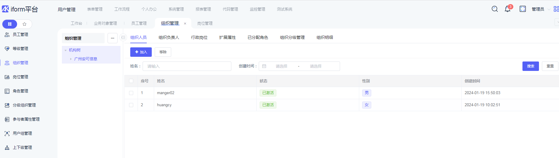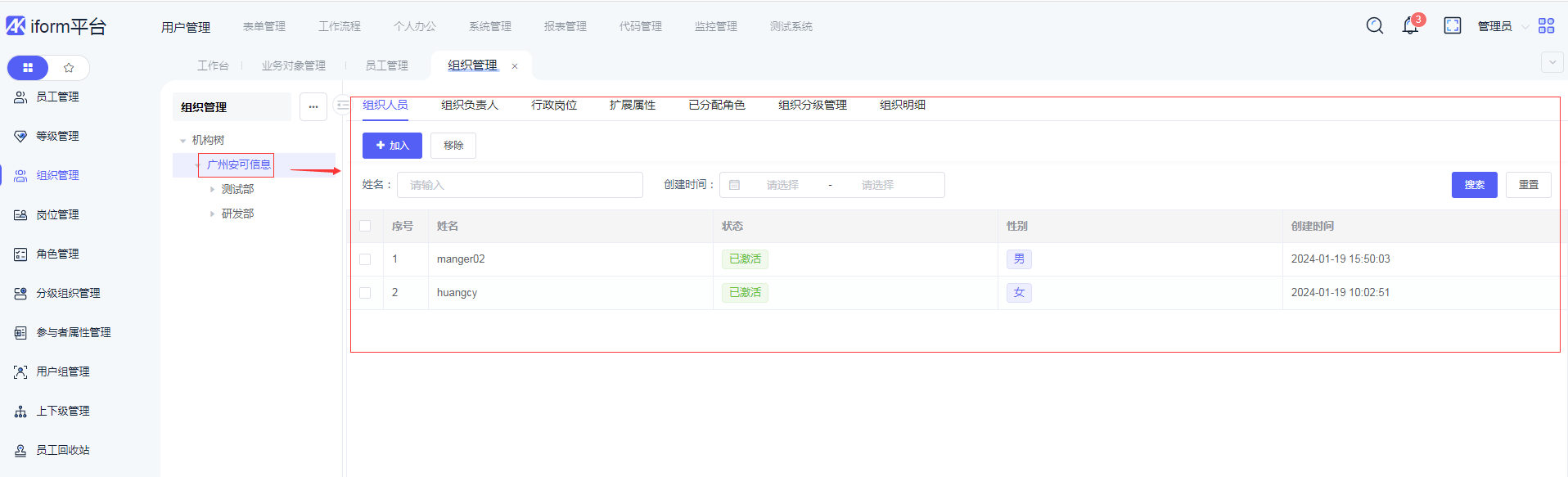 选中“组织人员”,即查看该组织下有哪些员工信息,还可点击“加入”按钮,将没有分配组织的员工进行配置:
