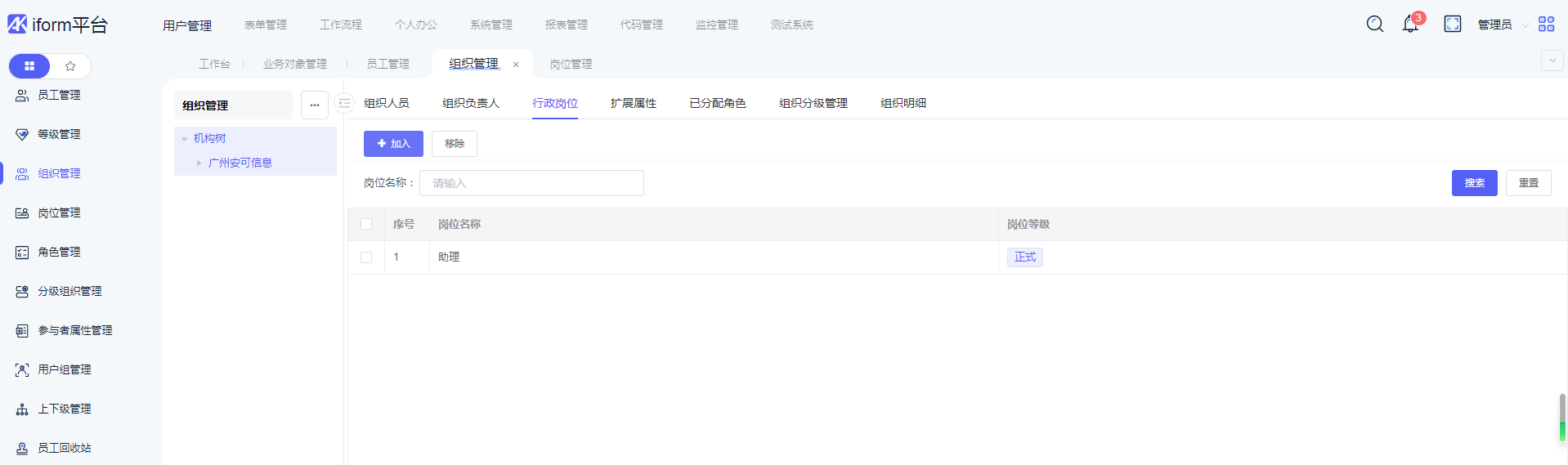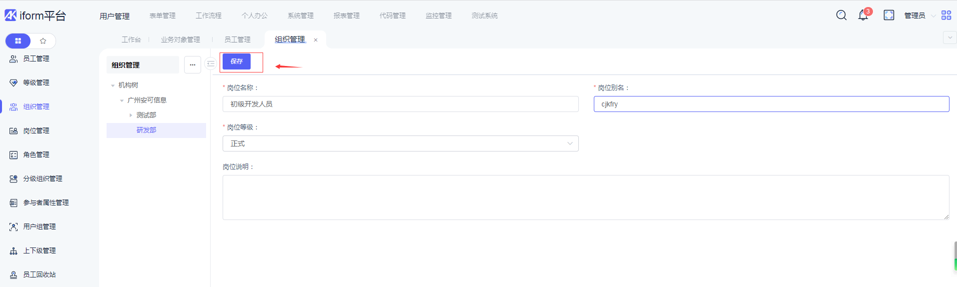 注意:行政岗位设置只能对应一个组织信息,若同个岗位信息需要配置多个部门,需要先在“岗位管理”增加对应的部门岗位信息,比如:测试员工,研发员工在岗位里面需要增加2个员工信息对应配置多个部门的业务,而不是只有一个员工岗位配置对应多个部门!