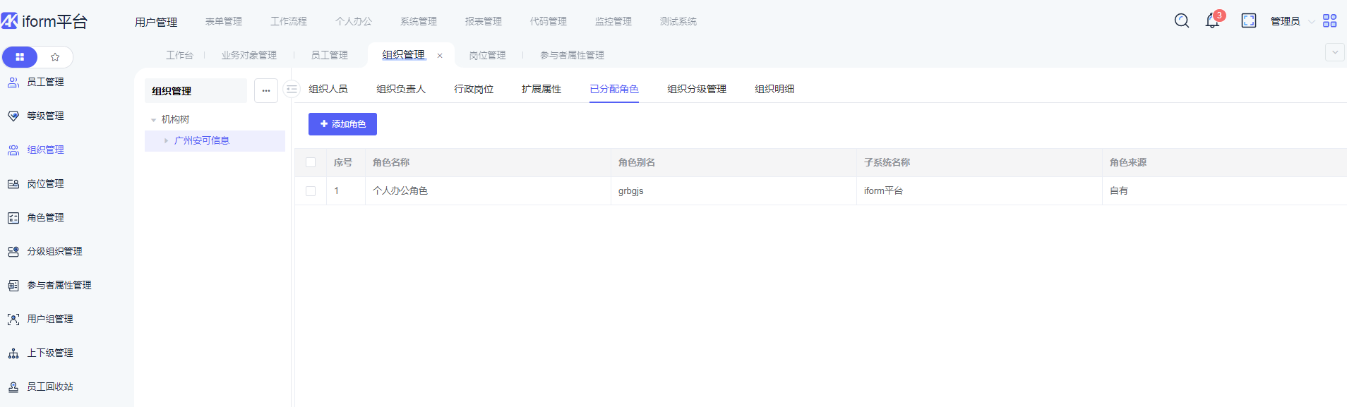 注意:子组织自动继承父级组织的角色,因此分配角色的菜单权限由通用到个性的原理进行分配,从而提高角色实施效率!
