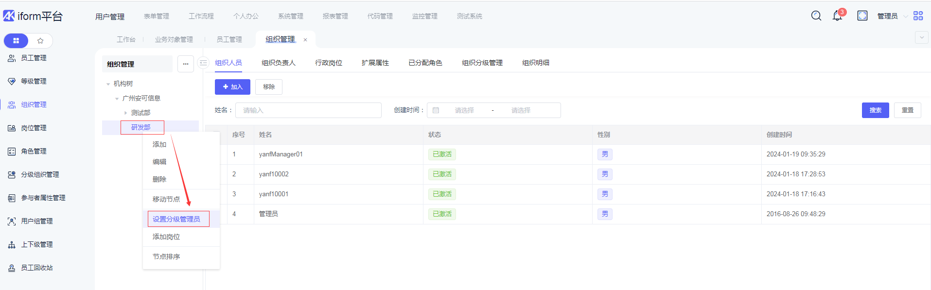 点击「用户管理 >> 组织管理>>机构树>>右击>>设置分级管理员按钮」,系统弹窗“添加分级管理员”页面,根据需求选择该组织的子管理员,比如:10001,且分配所有操作权限,配置完后该“10001”登录系统后可在「用户管理>>分级组织管理」看到该组织数据: