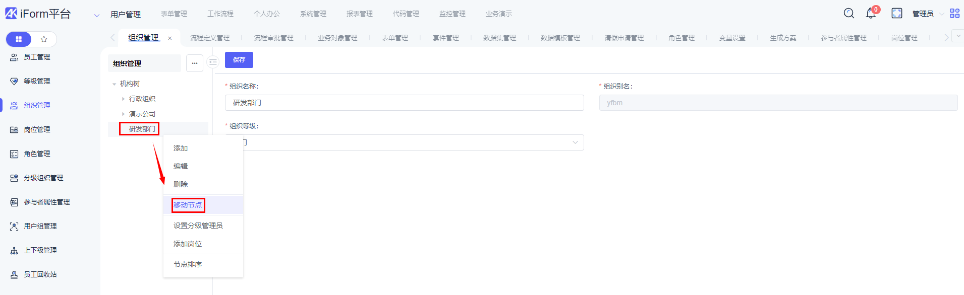 点击「用户管理 >> 组织管理>>机构树>>右击>>移动节点按钮」,选中需要移动节点的信息右击,系统自动弹窗选中父节点的页面,选择需要移动到哪个父节点后,点击“保存”按钮,即可完成移动组织节点信息: