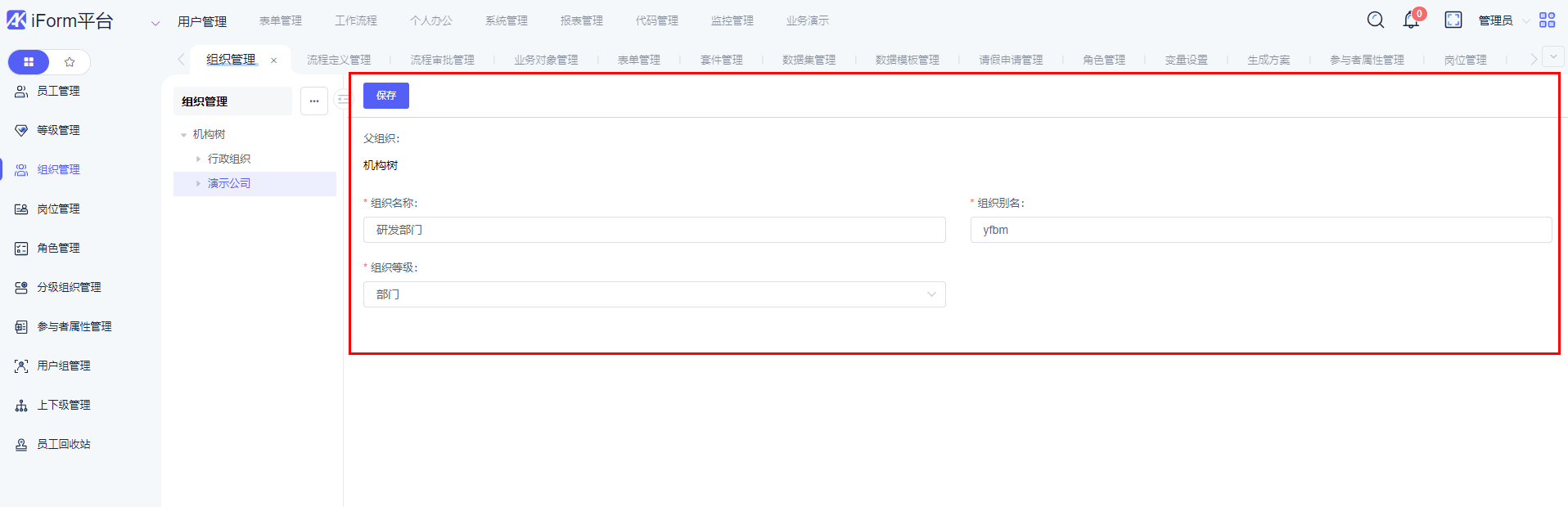点击「用户管理 >> 组织管理>>机构树>>右击>>添加按钮」,系统在右侧加载添加页面,根据用户需求输入相关信息,其中“组织别名”只能为字母开头,允许字母、数字和下划线且保证唯一性,填写完信息后点击左上角的“保存”按钮: