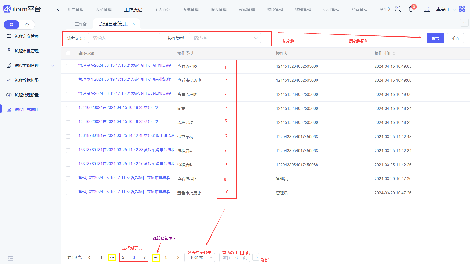 目录 搜索 展开 新手入门第一个流程用户管理员工管理等级管理组织管理岗位管理角色管理分级组织管理参与者属性管理用户组管理上下级管理员工回收站表单管理业务对象管理接口导入模式表单管理表单控件布局控件基础控件基础控件操作增强控件增强控件操作容器控件系统控件流程控件自定义控件组合控件报表控件其他控件大纲树表单套件业务对象表单属性特色功能表单样式详情表单管理套件管理组合表单管理数据管理数据集管理数据模板管理模版类型:默认数据模板-待办列表数据模板:树形数据模板:组合模版类型:对话框模版类型:值来源导出任务列表表单脚本案例表单按钮-前置事件表单提交校验-后端唯一校验表单脚本-约束信息唯一性主表数据相关功能脚本子表数据相关功能脚本数据模板脚本案例自定义按钮-更新数据自定义按钮-删除数据表单公式函数案例工作流程流程定义管理在线流程建模会签节点内部子流程外部子流程分支网关同步网关条件同步网关子流程多实例设置按钮全局设置用户任务设置流程案例操作说明流程审批管理流程实例管理正在运行列表结束实例列表流程数据权限流程代理设置流程日志统计个人办公流程中心我参与的流程已办任务管理我申请的流程流程抄送通知常用语管理待办事务管理审批流程按钮异常记录我的传阅列表个人桌面布局内部通讯消息中心信息管理用户交接管理系统管理系统配置授权管理系统附件定时计划流水号管理桌面管理桌面栏目分类管理服务管理系统日志国际化管理系统日志管理常用菜单管理数据交接管理导出日志Groovy脚本使用说明SaaS管理租户管理租户审核版本升级日志iform-v3.6.0版本更新日志说明 暂无相关搜索结果! 阅读次数:344 本文档使用 MinDoc 发布 流程日志统计 流程日志统计流程日志统计 简介:统计流程的【操作按钮】日志 作者:测试人员 创建时间:2024-04-17 10:12最后编辑:测试人员 更新时间:2025-11-28 15:39
