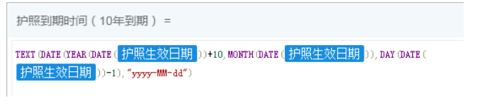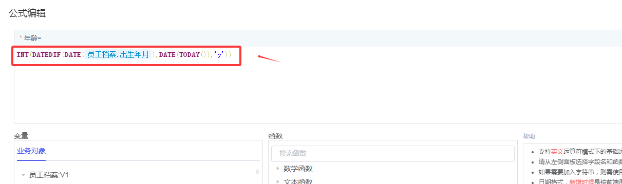 目录 搜索 展开 新手入门第一个流程用户管理员工管理等级管理组织管理岗位管理角色管理分级组织管理参与者属性管理用户组管理上下级管理员工回收站表单管理业务对象管理接口导入模式表单管理表单控件布局控件基础控件基础控件操作增强控件增强控件操作容器控件系统控件流程控件自定义控件组合控件报表控件其他控件大纲树表单套件业务对象表单属性特色功能表单样式详情表单管理套件管理组合表单管理数据管理数据集管理数据模板管理模版类型:默认数据模板-待办列表数据模板:树形数据模板:组合模版类型:对话框模版类型:值来源导出任务列表表单脚本案例表单按钮-前置事件表单提交校验-后端唯一校验表单脚本-约束信息唯一性主表数据相关功能脚本子表数据相关功能脚本数据模板脚本案例自定义按钮-更新数据自定义按钮-删除数据表单公式函数案例工作流程流程定义管理在线流程建模会签节点内部子流程外部子流程分支网关同步网关条件同步网关子流程多实例设置按钮全局设置用户任务设置流程案例操作说明流程审批管理流程实例管理正在运行列表结束实例列表流程数据权限流程代理设置流程日志统计个人办公流程中心我参与的流程已办任务管理我申请的流程流程抄送通知常用语管理待办事务管理审批流程按钮异常记录我的传阅列表个人桌面布局内部通讯消息中心信息管理用户交接管理系统管理系统配置授权管理系统附件定时计划流水号管理桌面管理桌面栏目分类管理服务管理系统日志国际化管理系统日志管理常用菜单管理数据交接管理导出日志Groovy脚本使用说明SaaS管理租户管理租户审核版本升级日志iform-v3.6.0版本更新日志说明 暂无相关搜索结果! 阅读次数:39 本文档使用 MinDoc 发布 表单公式函数案例 1、根据出生日期自动计算出年龄2、计算两个日期之间的小时数、分钟数3、根据身份证计算男女性别4、护照的到期时间(10年到期)1、根据出生日期自动计算出年龄获取主表的出生年月信息,在调用DATE和DATEDIF进行计算日期的时差,然后再调用INT函数取整,配置公式如下图:2、计算两个日期之间的小时数、分钟数配置后的效果:3、根据身份证计算男女性别(1)身份证的第17位数为奇数的时候,返回“男”,否则返回“女”(2)身份证的第17位数为1,3,5,7,9的时候,返回“男”,否则返回“女”4、护照的到期时间(10年到期)作者:黄春艳 创建时间:2025-11-07 17:59最后编辑:黄春艳 更新时间:2025-11-28 15:39