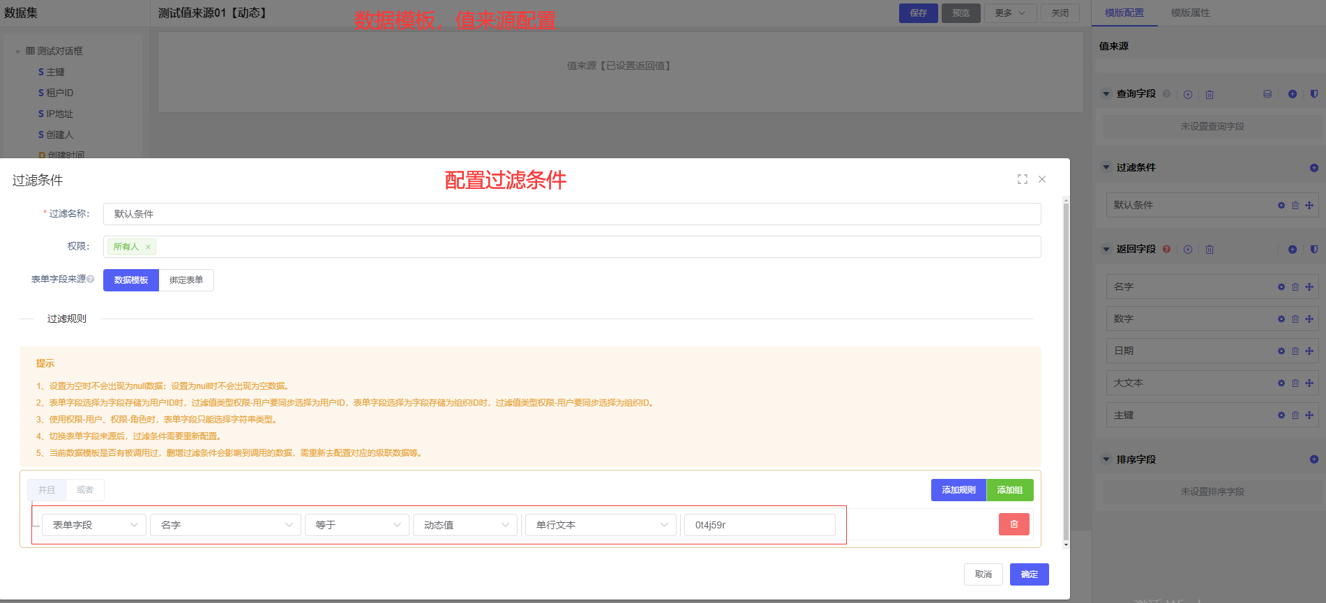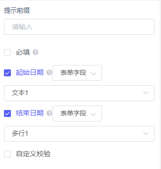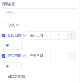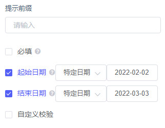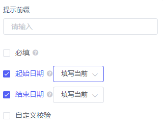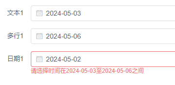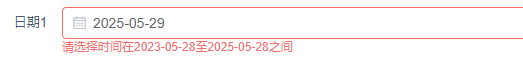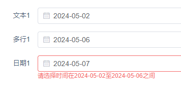 注意:指定日期,表单字段,填写当前日期,当天日期前,当前日期后可以配置多种组合[不局限相同配置的数据]【例如:启始时间[填写当前日期]结束时间[指定日期]】
