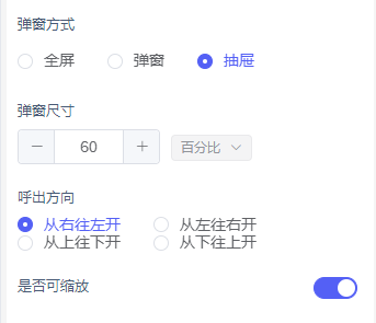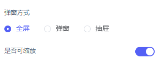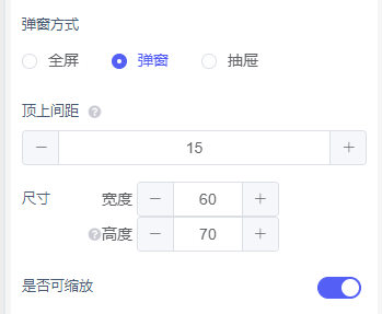 ②弹窗:弹窗显示,可设置顶上间距、弹窗尺寸、是否可缩放