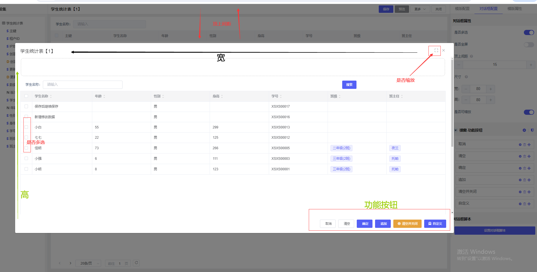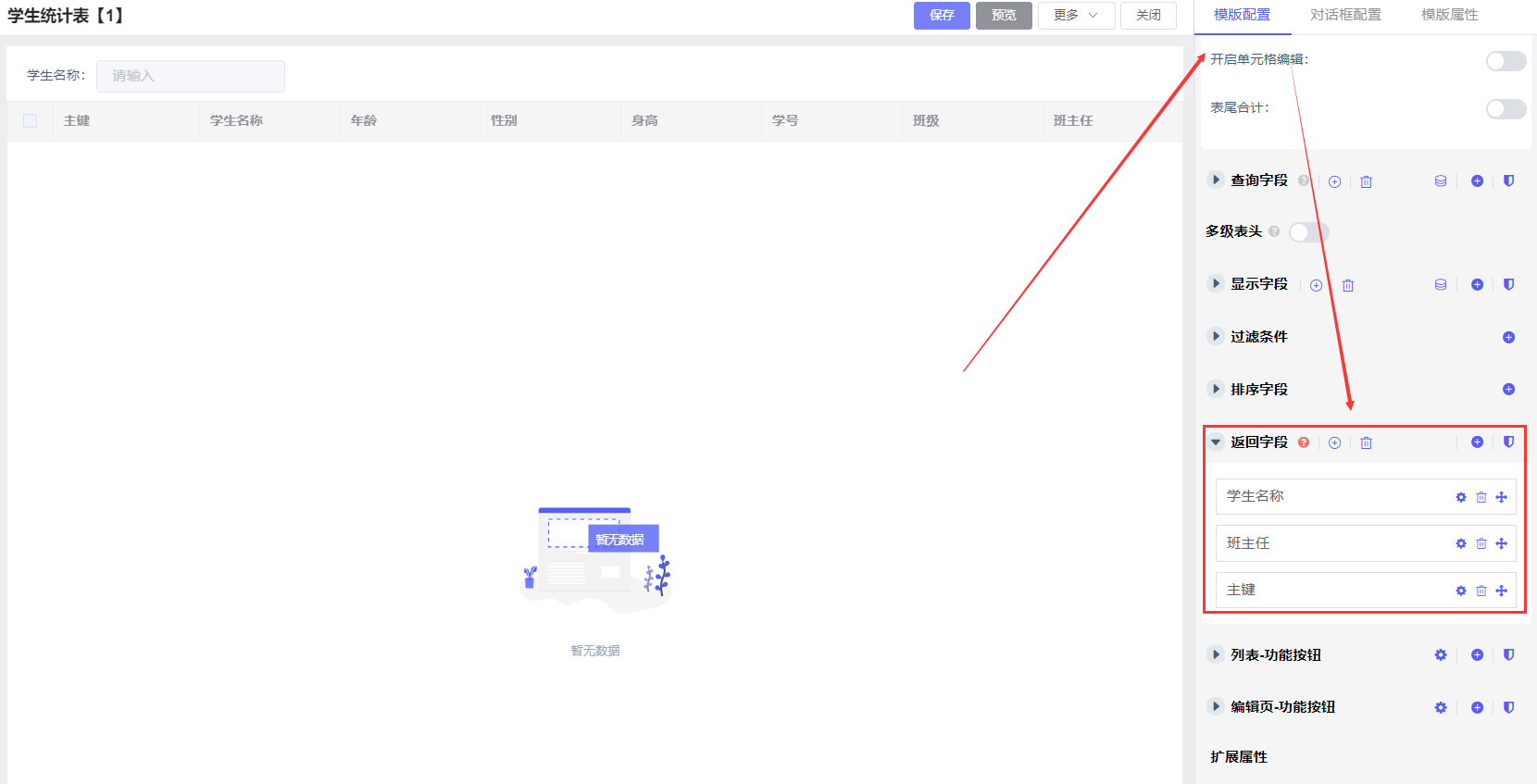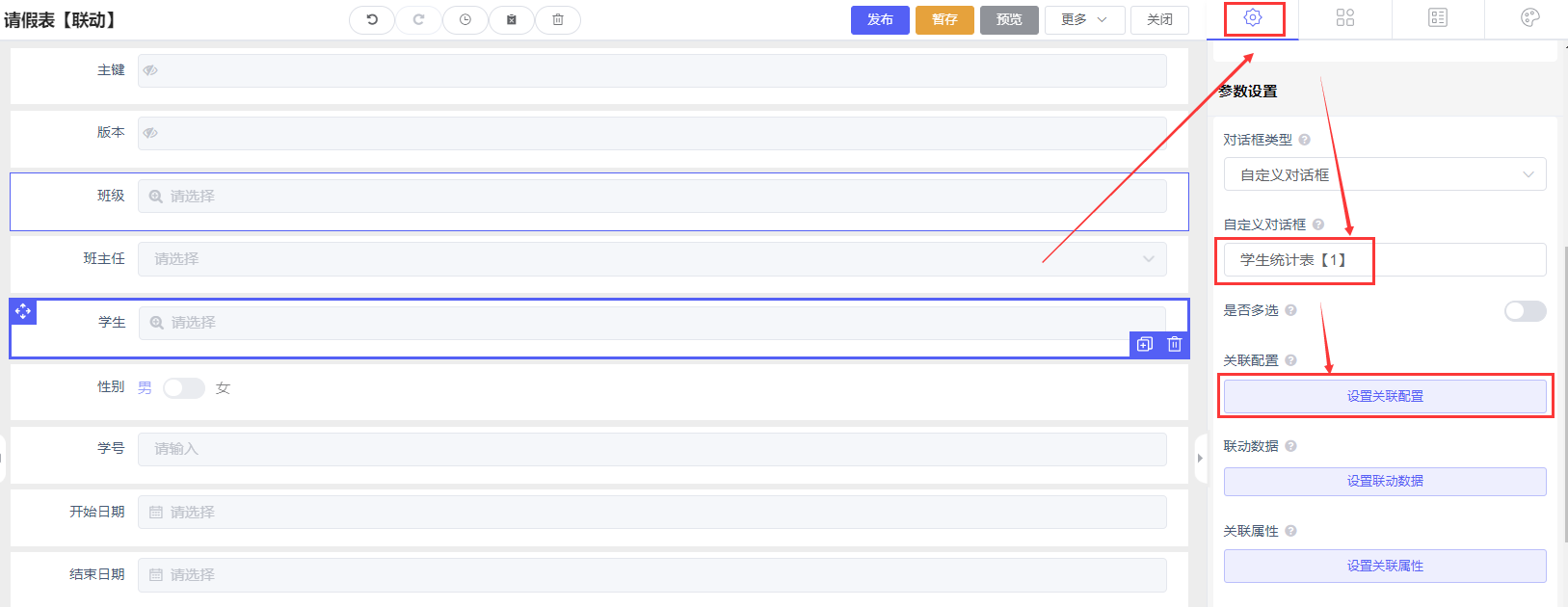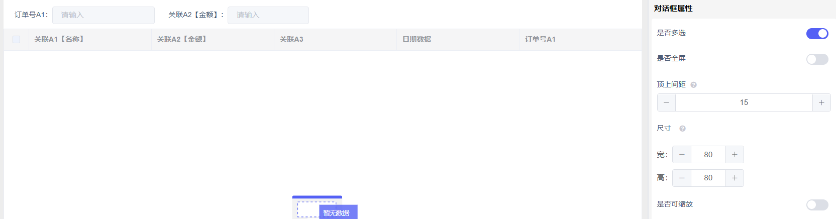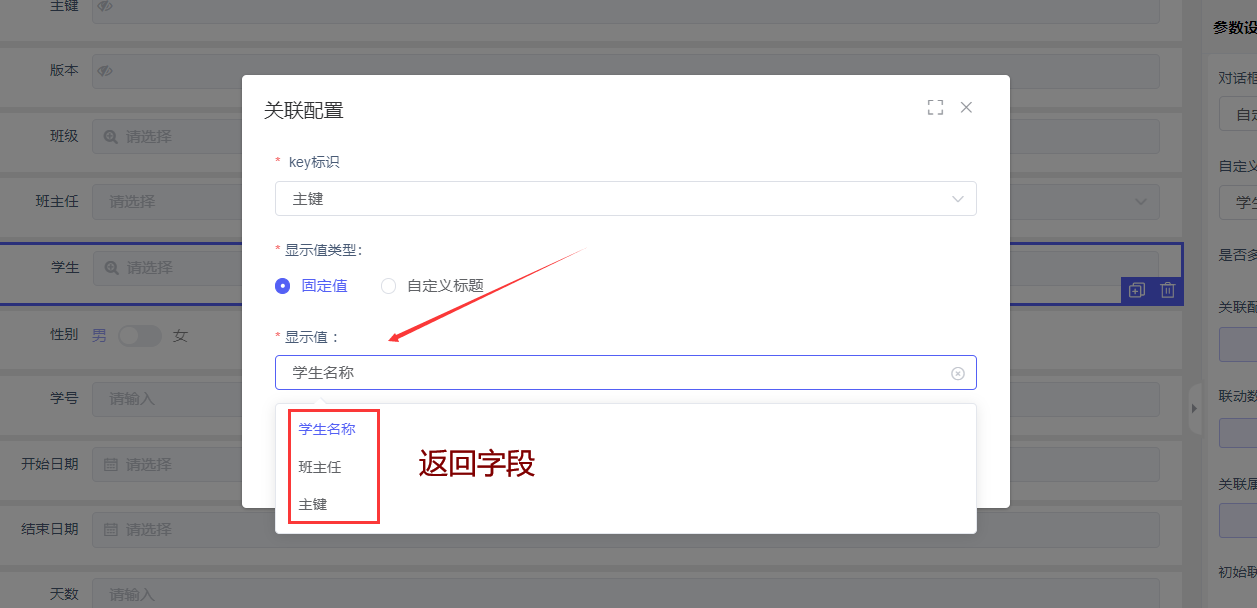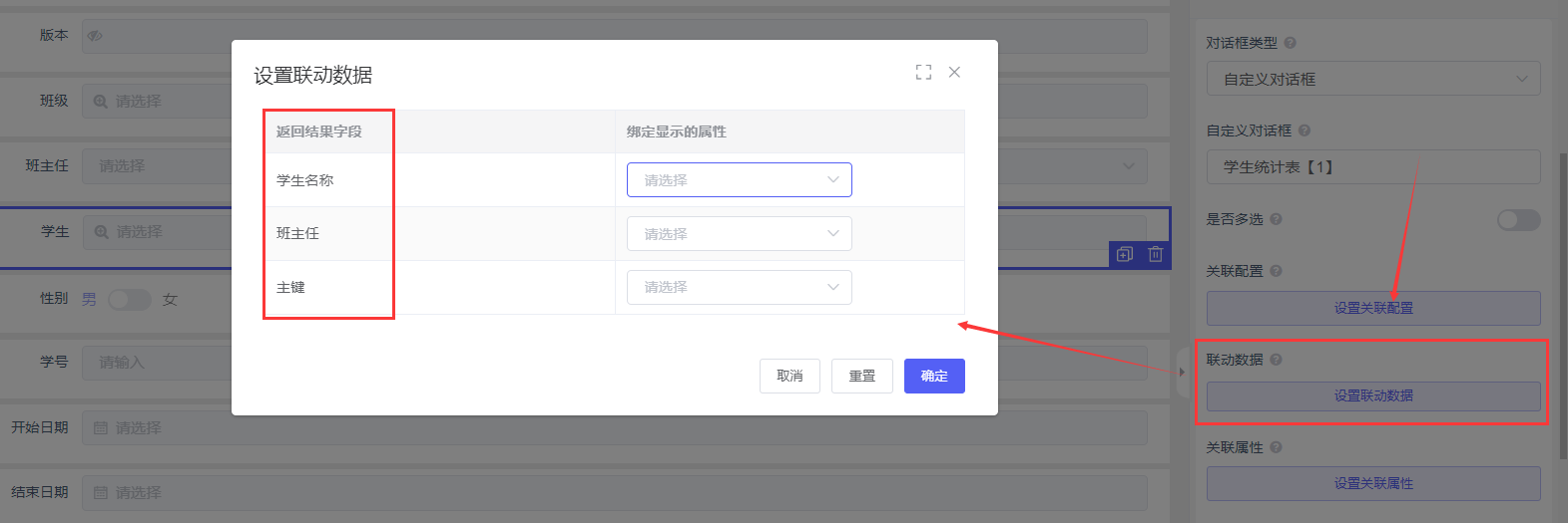 对话框控件内可以配置返回字段,联动字段也可以配置返回字段联动