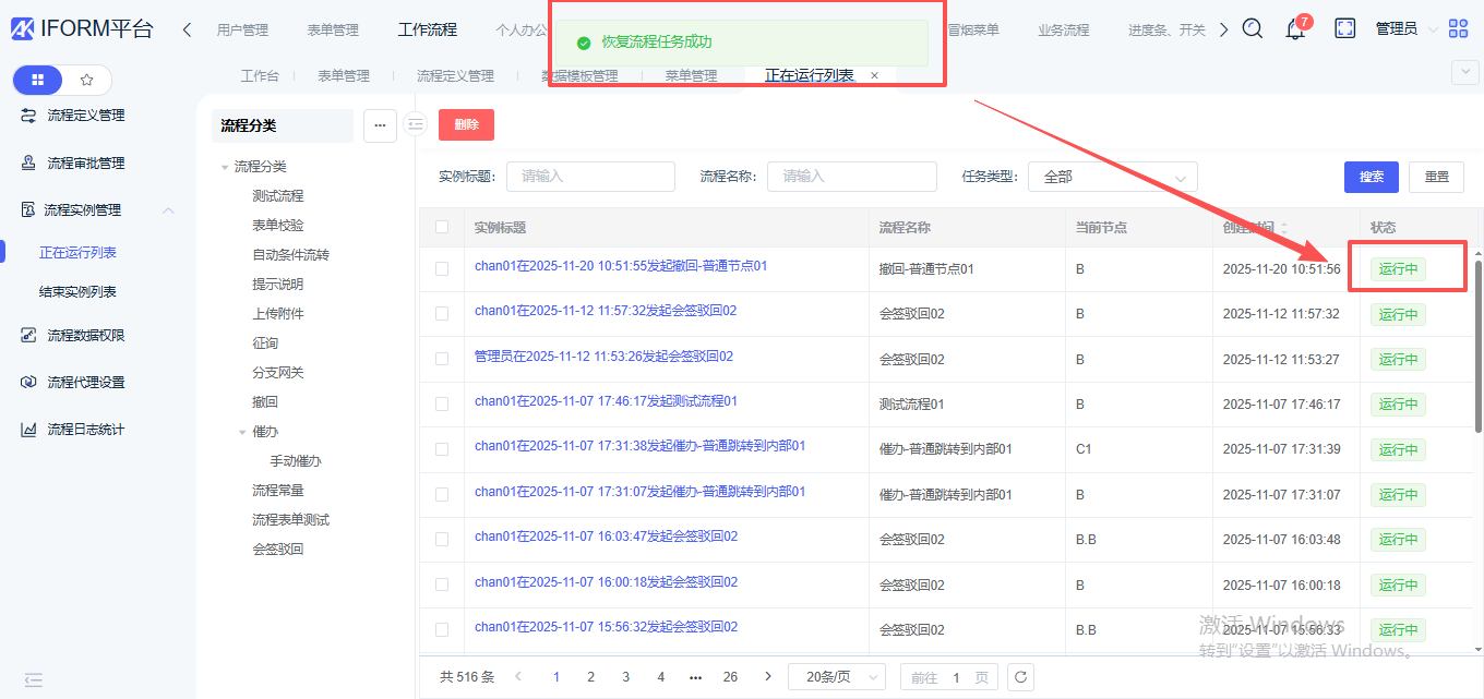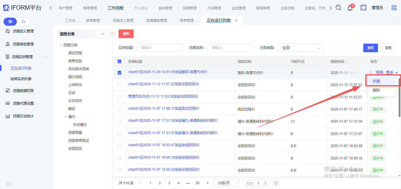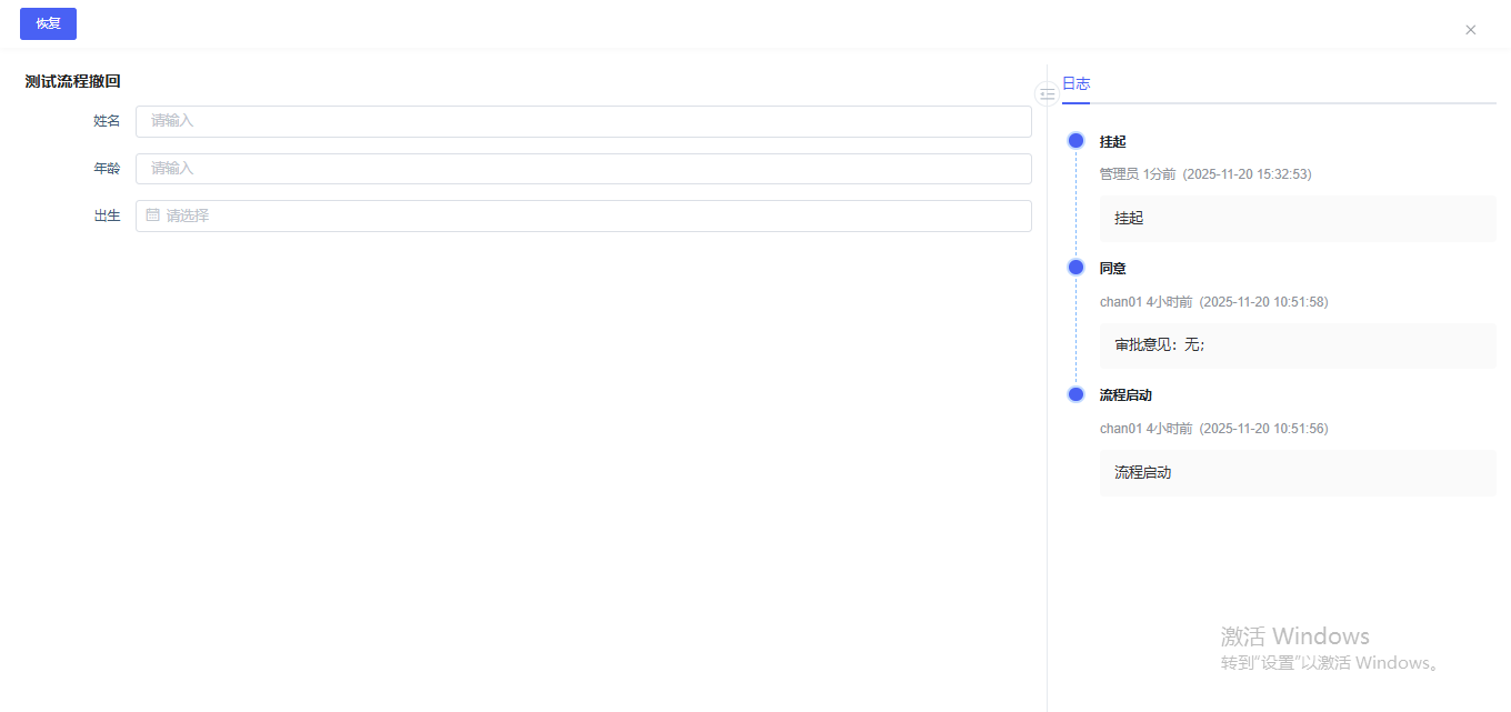 此时,使用待执行人账号查看该实例时,只能进行【恢复】操作,不可进行审批