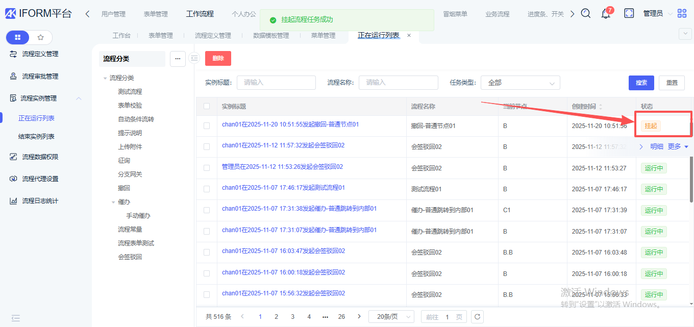 成功挂起后,实例状态为【挂起】