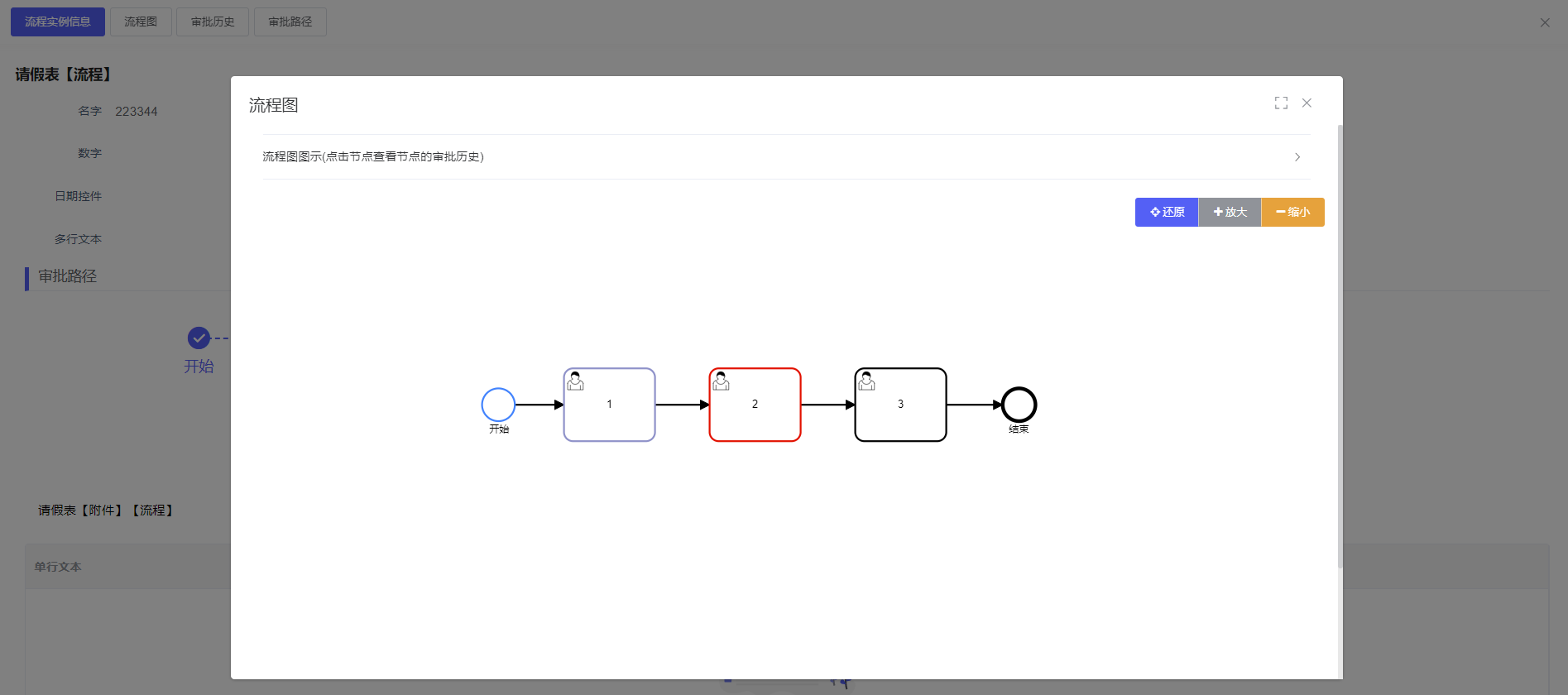 查看流程设计,点击节点可以查看审批历史