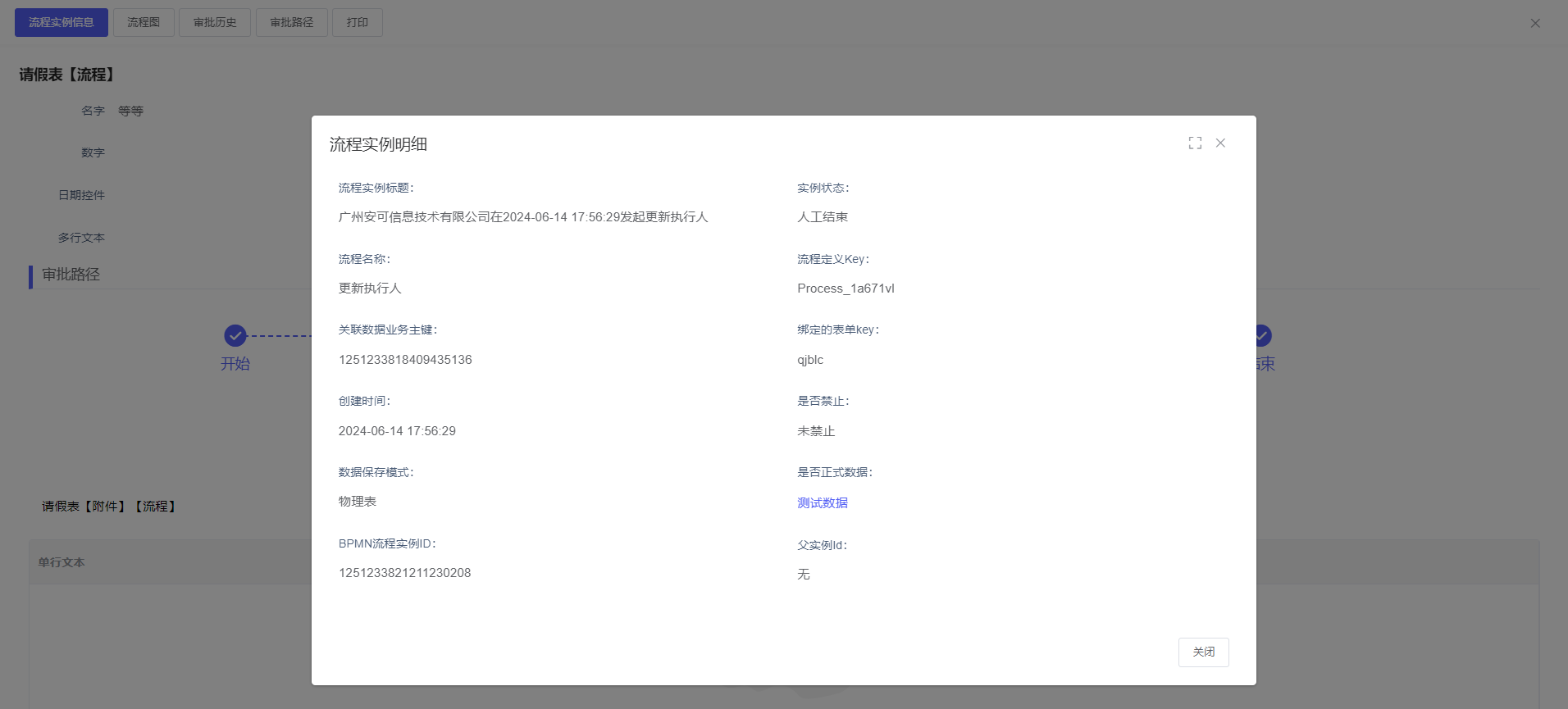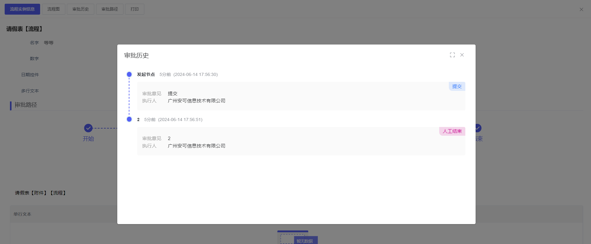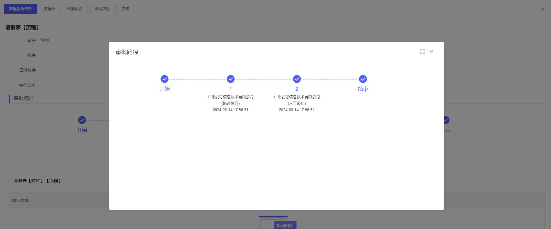 目录 搜索 展开 新手入门第一个流程用户管理员工管理等级管理组织管理岗位管理角色管理分级组织管理参与者属性管理用户组管理上下级管理员工回收站表单管理业务对象管理接口导入模式表单管理表单控件布局控件基础控件基础控件操作增强控件增强控件操作容器控件系统控件流程控件自定义控件组合控件报表控件其他控件大纲树表单套件业务对象表单属性特色功能表单样式详情表单管理套件管理组合表单管理数据管理数据集管理数据模板管理模版类型:默认数据模板-待办列表数据模板:树形数据模板:组合模版类型:对话框模版类型:值来源导出任务列表表单脚本案例表单按钮-前置事件表单提交校验-后端唯一校验表单脚本-约束信息唯一性主表数据相关功能脚本子表数据相关功能脚本数据模板脚本案例自定义按钮-更新数据自定义按钮-删除数据表单公式函数案例工作流程流程定义管理在线流程建模会签节点内部子流程外部子流程分支网关同步网关条件同步网关子流程多实例设置按钮全局设置用户任务设置流程案例操作说明流程审批管理流程实例管理正在运行列表结束实例列表流程数据权限流程代理设置流程日志统计个人办公流程中心我参与的流程已办任务管理我申请的流程流程抄送通知常用语管理待办事务管理审批流程按钮异常记录我的传阅列表个人桌面布局内部通讯消息中心信息管理用户交接管理系统管理系统配置授权管理系统附件定时计划流水号管理桌面管理桌面栏目分类管理服务管理系统日志国际化管理系统日志管理常用菜单管理数据交接管理导出日志Groovy脚本使用说明SaaS管理租户管理租户审核版本升级日志iform-v3.6.0版本更新日志说明 暂无相关搜索结果! 阅读次数:289 本文档使用 MinDoc 发布 结束实例列表 结束实例列表明细流程实例信息流程图审批历史审批路劲打印结束实例列表 记录已结束的流程数据 明细流程实例信息流程图审批历史审批路劲 记录审批的操作路径 打印 流程未配置打印模板 流程配置打印模板 作者:测试人员 创建时间:2024-06-14 14:46最后编辑:测试人员 更新时间:2025-11-28 15:39