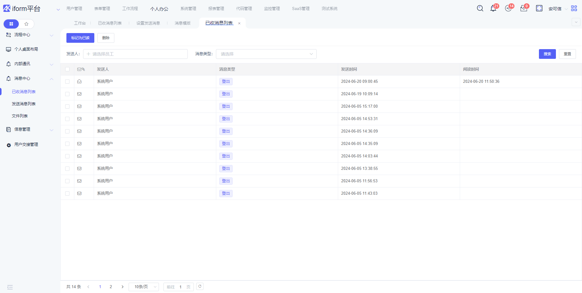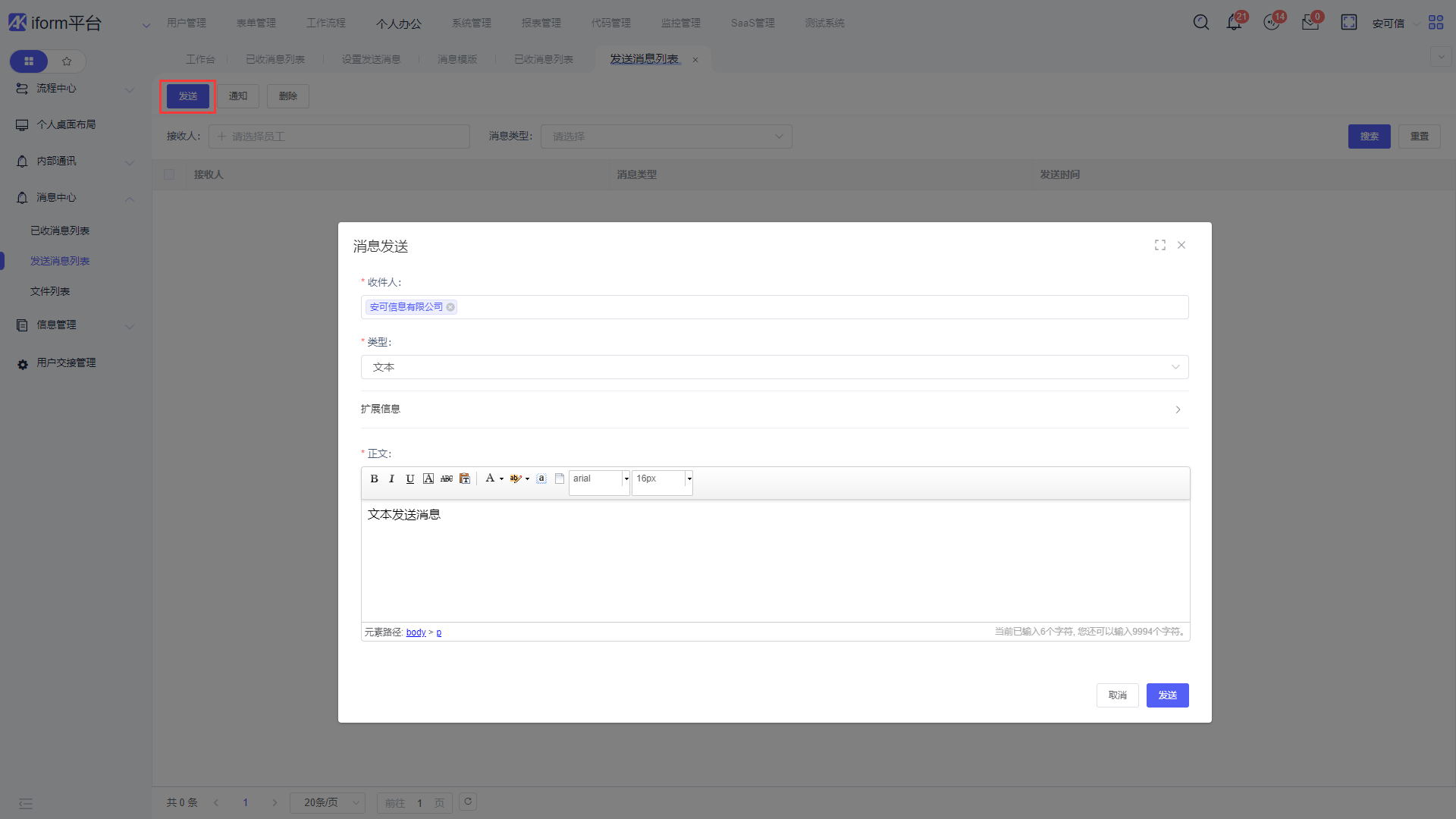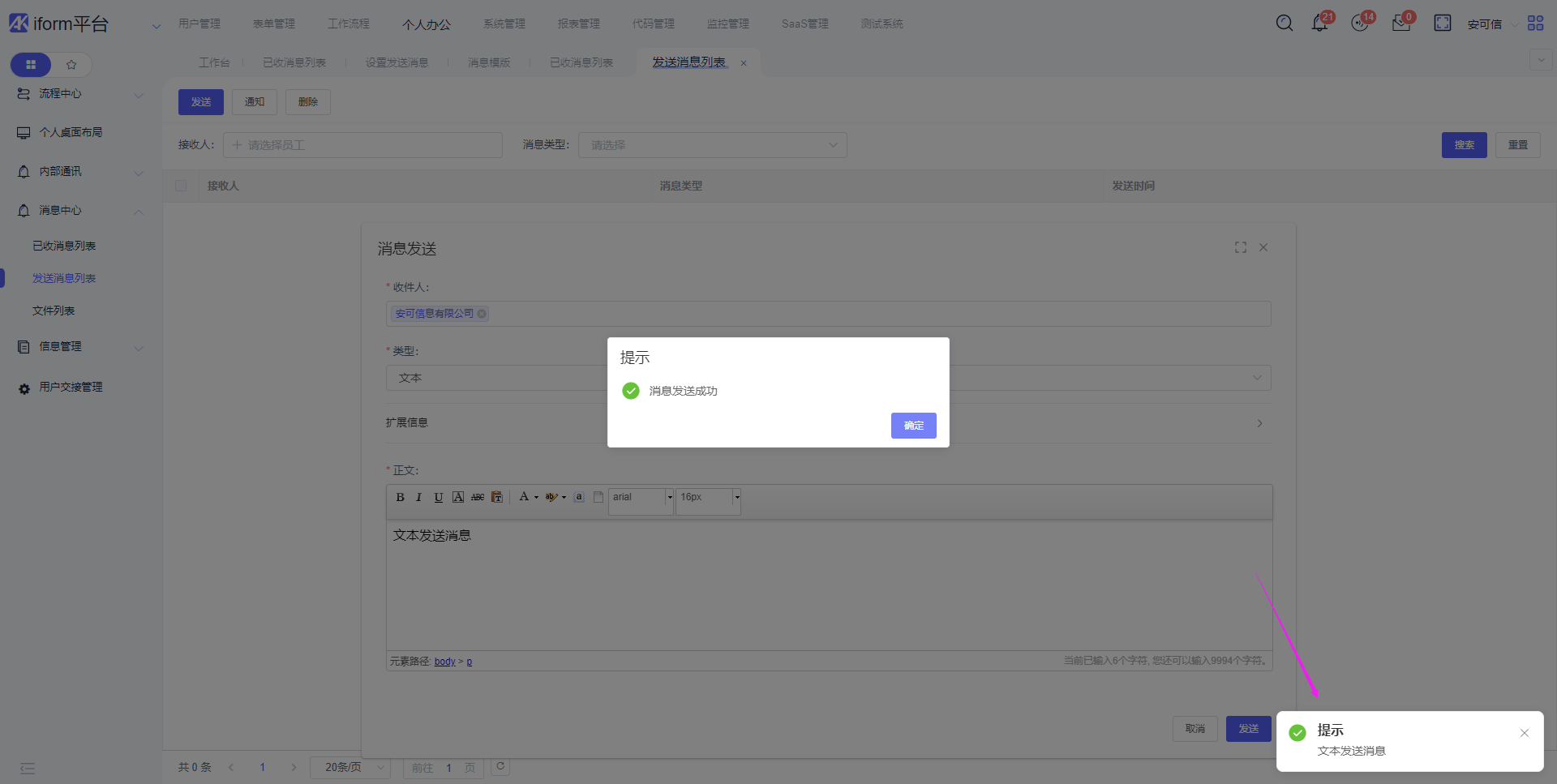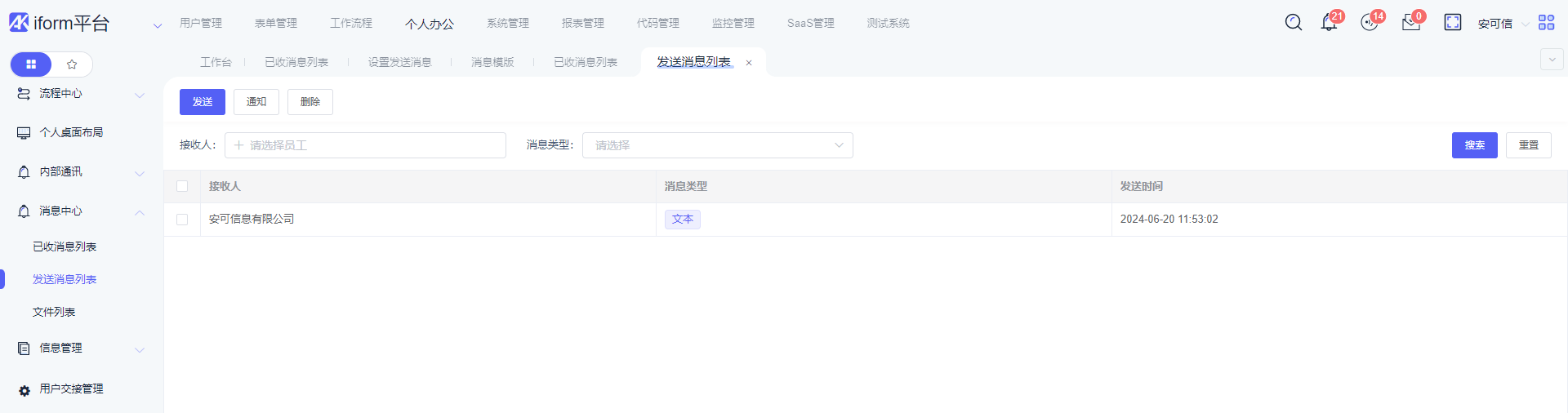 简介:本功能可以指定给人员发送消息,列表显示本账号发送出去的消息,