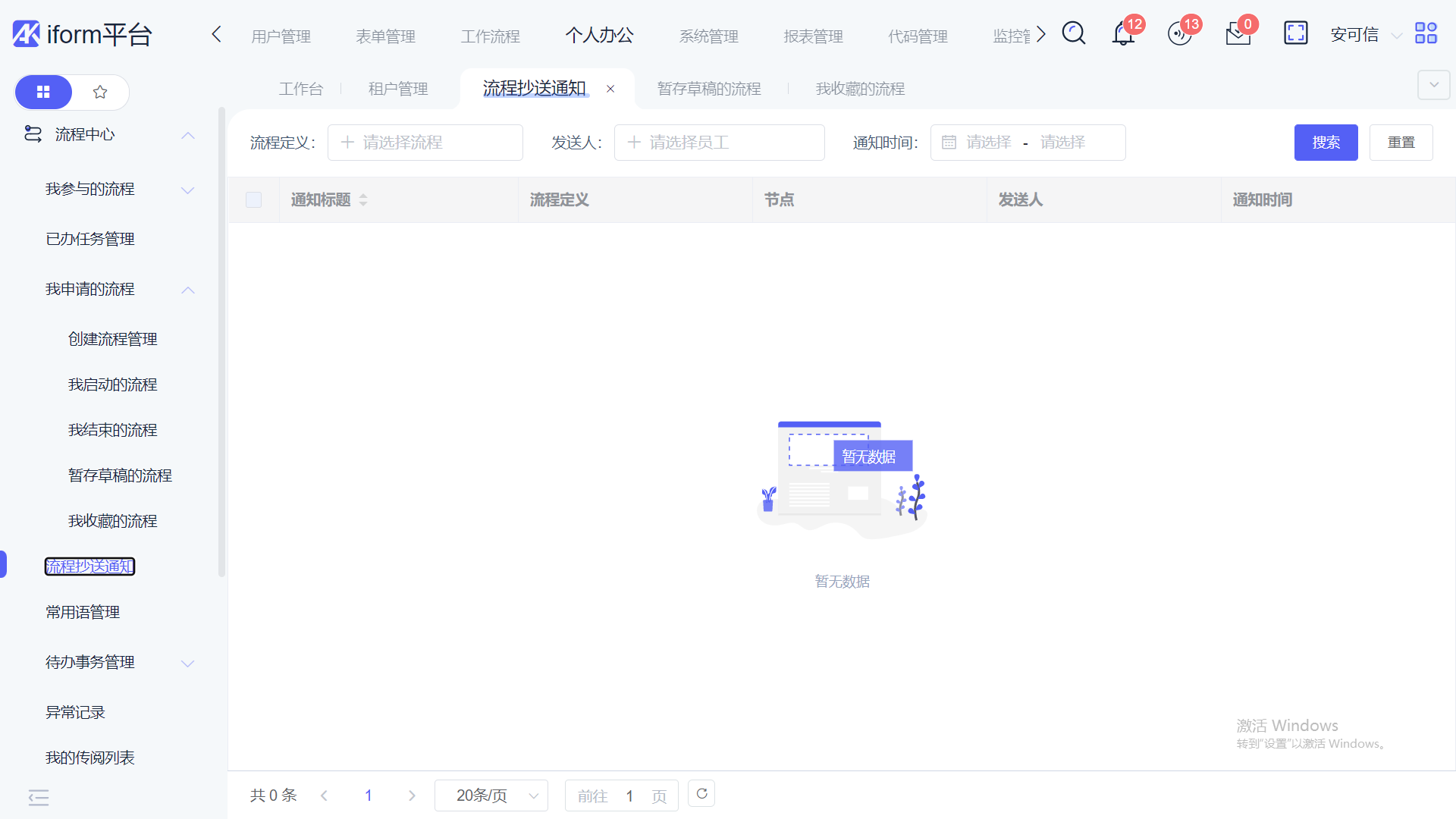 1、流程节点审核通过后,指定抄送到本账号(在节点内配置办理抄送通知)