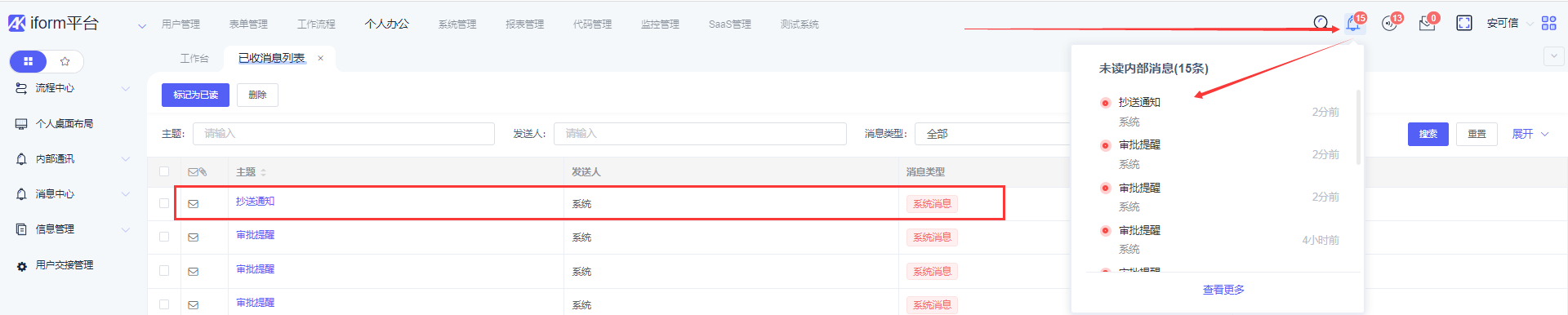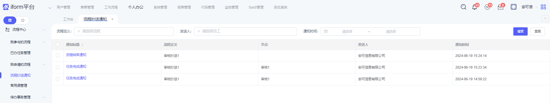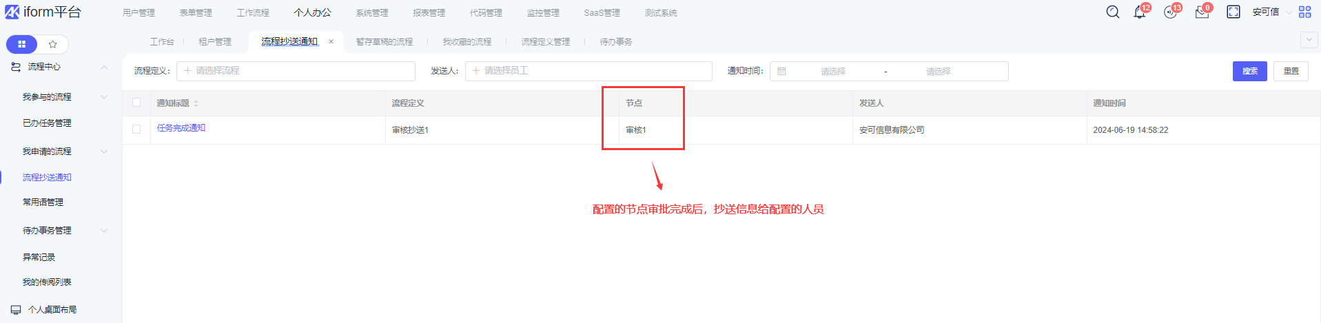 配置的节点审批完成后,抄送给本账号,本账号可以查看抄送信息