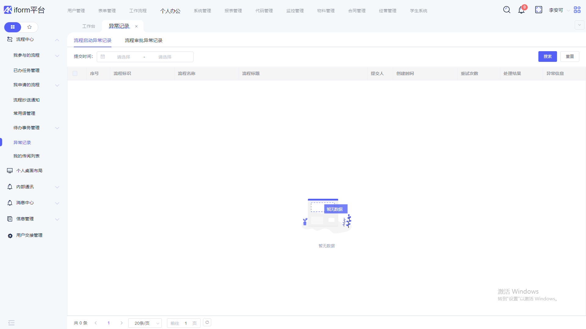 目录 搜索 展开 新手入门第一个流程用户管理员工管理等级管理组织管理岗位管理角色管理分级组织管理参与者属性管理用户组管理上下级管理员工回收站表单管理业务对象管理接口导入模式表单管理表单控件布局控件基础控件基础控件操作增强控件增强控件操作容器控件系统控件流程控件自定义控件组合控件报表控件其他控件大纲树表单套件业务对象表单属性特色功能表单样式详情表单管理套件管理组合表单管理数据管理数据集管理数据模板管理模版类型:默认数据模板-待办列表数据模板:树形数据模板:组合模版类型:对话框模版类型:值来源导出任务列表表单脚本案例表单按钮-前置事件表单提交校验-后端唯一校验表单脚本-约束信息唯一性主表数据相关功能脚本子表数据相关功能脚本数据模板脚本案例自定义按钮-更新数据自定义按钮-删除数据表单公式函数案例工作流程流程定义管理在线流程建模会签节点内部子流程外部子流程分支网关同步网关条件同步网关子流程多实例设置按钮全局设置用户任务设置流程案例操作说明流程审批管理流程实例管理正在运行列表结束实例列表流程数据权限流程代理设置流程日志统计个人办公流程中心我参与的流程已办任务管理我申请的流程流程抄送通知常用语管理待办事务管理审批流程按钮异常记录我的传阅列表个人桌面布局内部通讯消息中心信息管理用户交接管理系统管理系统配置授权管理系统附件定时计划流水号管理桌面管理桌面栏目分类管理服务管理系统日志国际化管理系统日志管理常用菜单管理数据交接管理导出日志Groovy脚本使用说明SaaS管理租户管理租户审核版本升级日志iform-v3.6.0版本更新日志说明 暂无相关搜索结果! 阅读次数:277 本文档使用 MinDoc 发布 异常记录 异常记录异常记录 简介:记录启动流程异常与审批流程的流程异常 作者:测试人员 创建时间:2024-06-19 10:16最后编辑:测试人员 更新时间:2025-11-28 15:39