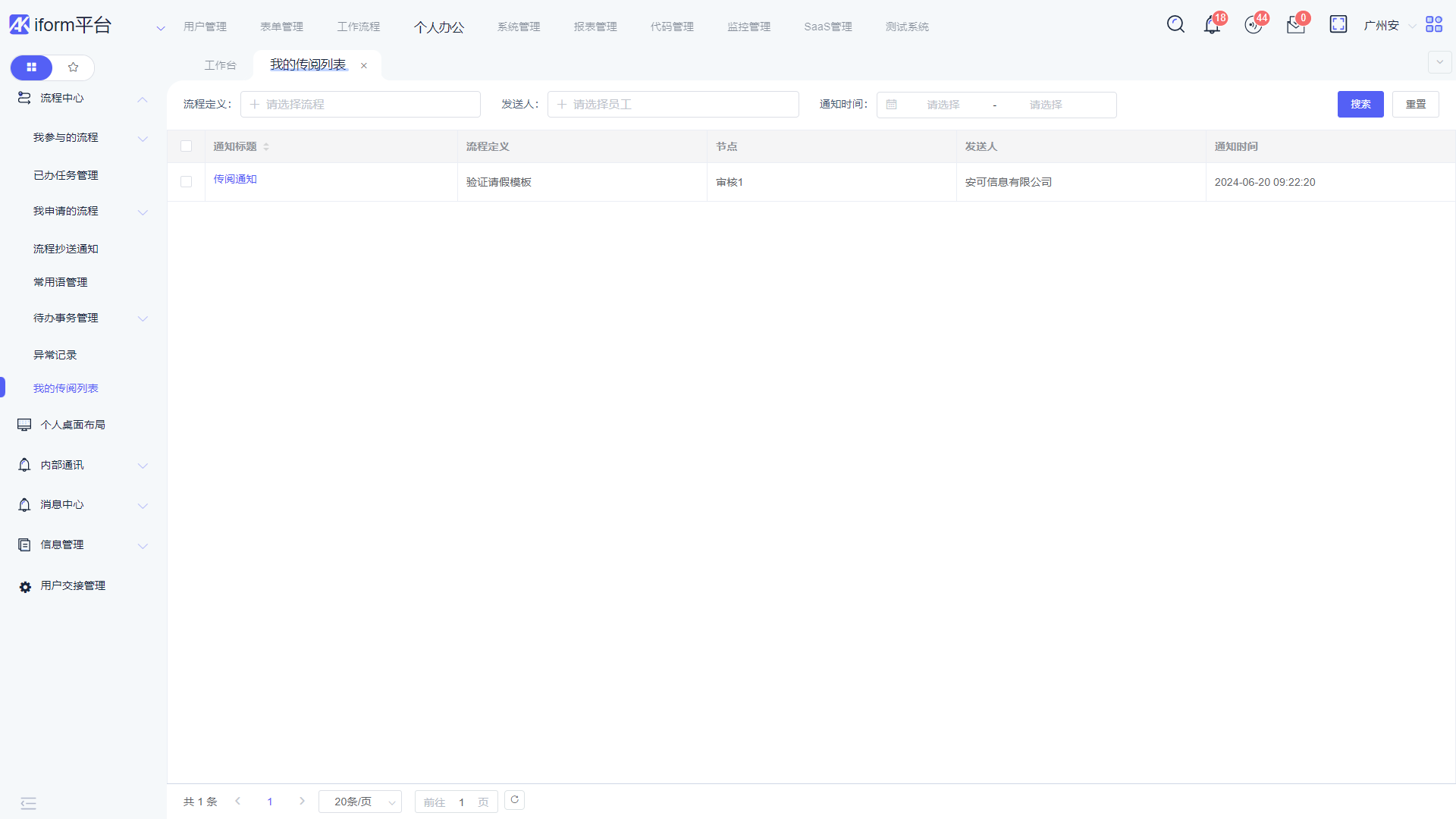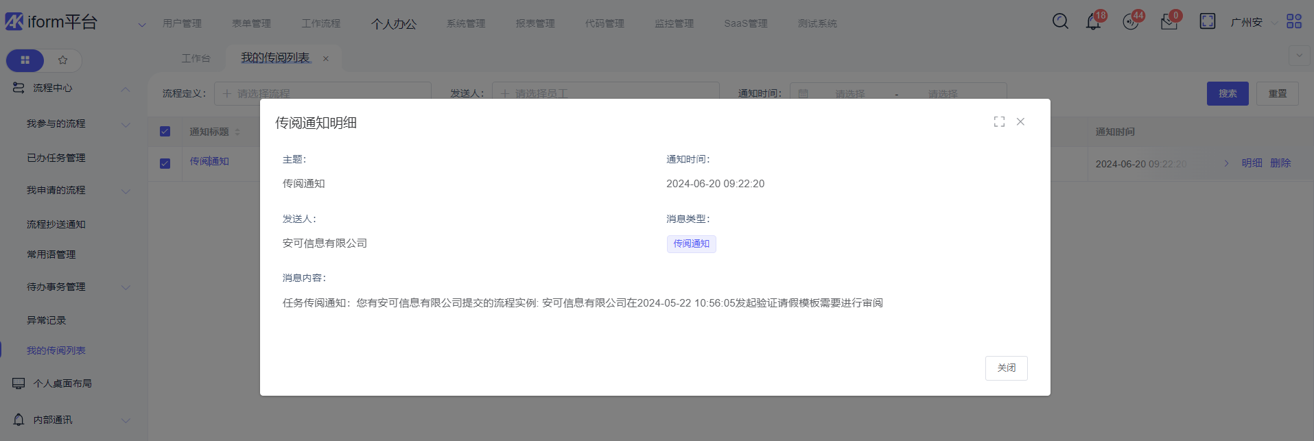 目录 搜索 展开 新手入门第一个流程用户管理员工管理等级管理组织管理岗位管理角色管理分级组织管理参与者属性管理用户组管理上下级管理员工回收站表单管理业务对象管理接口导入模式表单管理表单控件布局控件基础控件基础控件操作增强控件增强控件操作容器控件系统控件流程控件自定义控件组合控件报表控件其他控件大纲树表单套件业务对象表单属性特色功能表单样式详情表单管理套件管理组合表单管理数据管理数据集管理数据模板管理模版类型:默认数据模板-待办列表数据模板:树形数据模板:组合模版类型:对话框模版类型:值来源导出任务列表表单脚本案例表单按钮-前置事件表单提交校验-后端唯一校验表单脚本-约束信息唯一性主表数据相关功能脚本子表数据相关功能脚本数据模板脚本案例自定义按钮-更新数据自定义按钮-删除数据表单公式函数案例工作流程流程定义管理在线流程建模会签节点内部子流程外部子流程分支网关同步网关条件同步网关子流程多实例设置按钮全局设置用户任务设置流程案例操作说明流程审批管理流程实例管理正在运行列表结束实例列表流程数据权限流程代理设置流程日志统计个人办公流程中心我参与的流程已办任务管理我申请的流程流程抄送通知常用语管理待办事务管理审批流程按钮异常记录我的传阅列表个人桌面布局内部通讯消息中心信息管理用户交接管理系统管理系统配置授权管理系统附件定时计划流水号管理桌面管理桌面栏目分类管理服务管理系统日志国际化管理系统日志管理常用菜单管理数据交接管理导出日志Groovy脚本使用说明SaaS管理租户管理租户审核版本升级日志iform-v3.6.0版本更新日志说明 暂无相关搜索结果! 阅读次数:305 本文档使用 MinDoc 发布 我的传阅列表 我的传阅列表操作步骤我的传阅列表 列表显示传阅本账号的信息 操作步骤待办事务——审批流程——审批传阅作者:测试人员 创建时间:2024-06-19 10:16最后编辑:测试人员 更新时间:2025-11-28 15:39