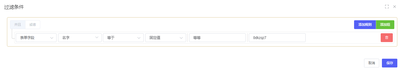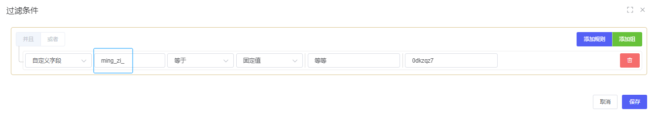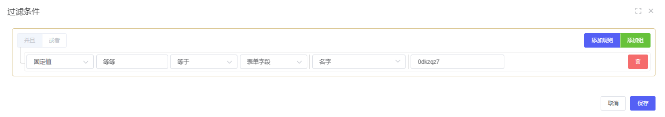 过滤条件:配置过滤条件,根据字段,自定义字段