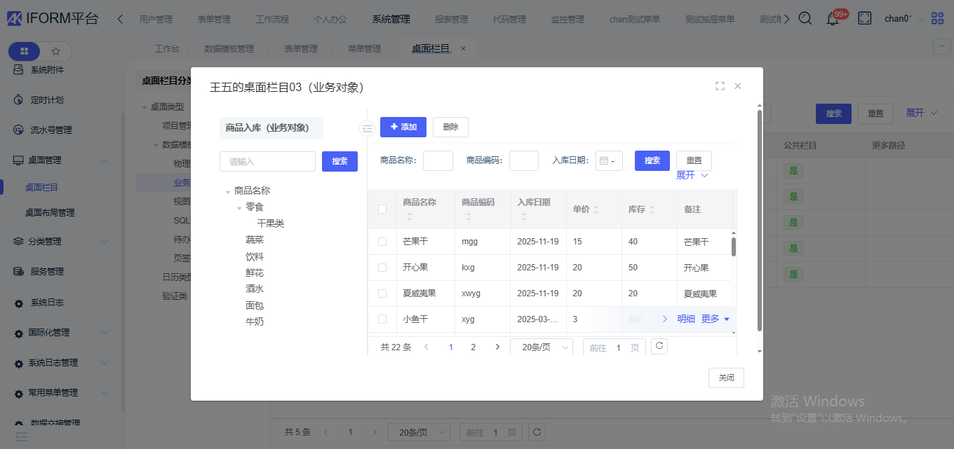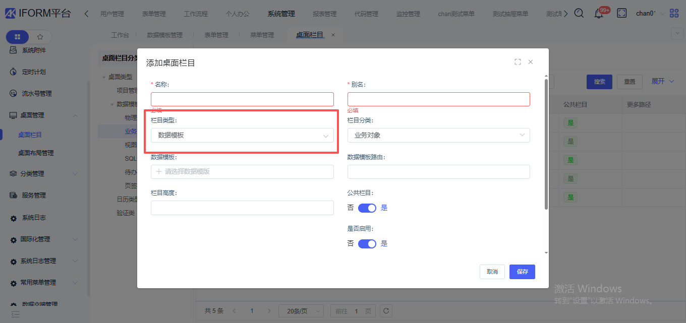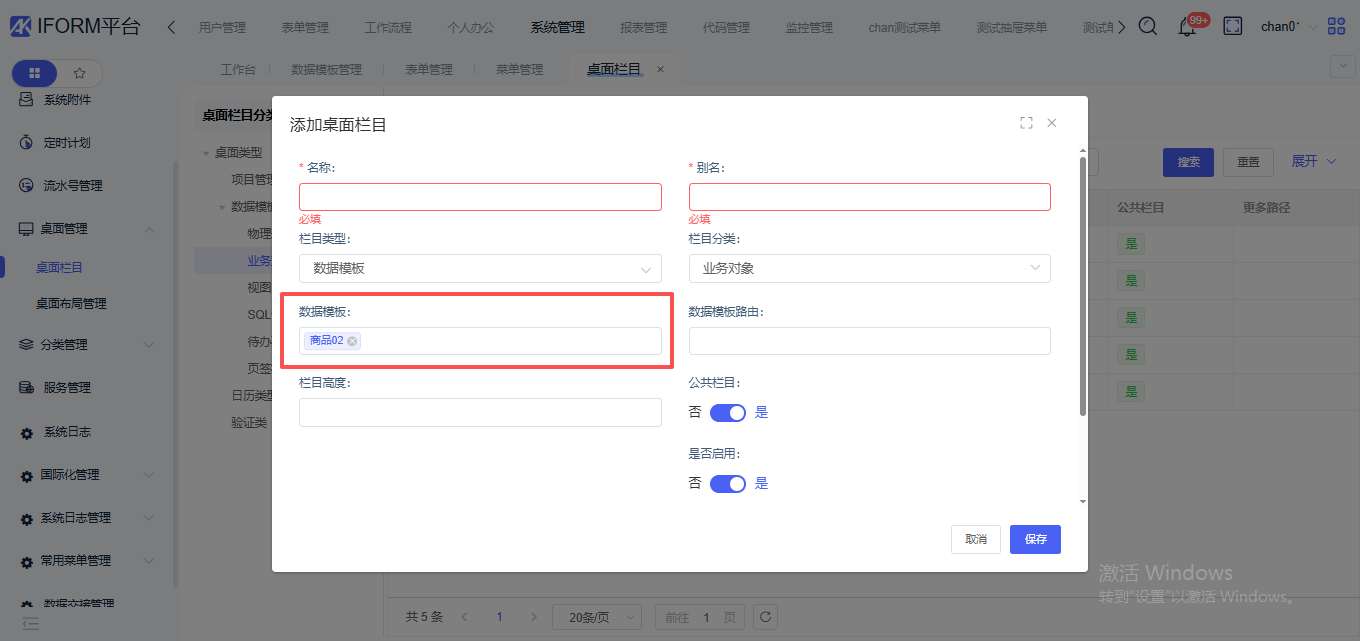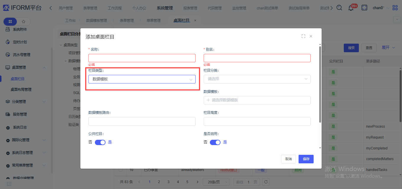 数据模板:选择已创建好的数据模板(支持列表、树形、组合[左树右列表、左列表右树、左树右表单、左右布局、页签布局]数据模板)
