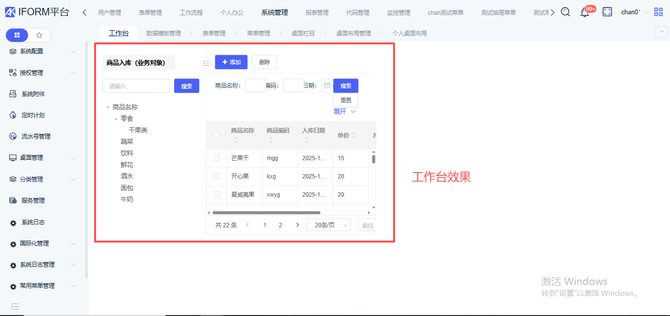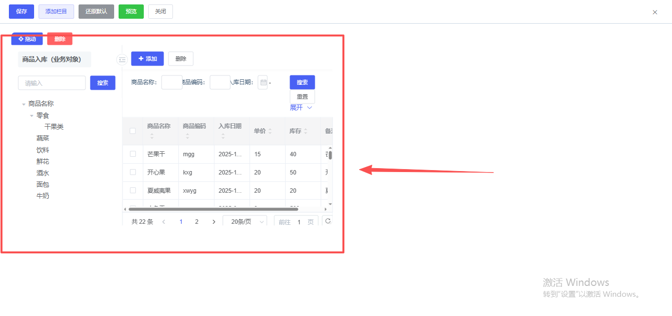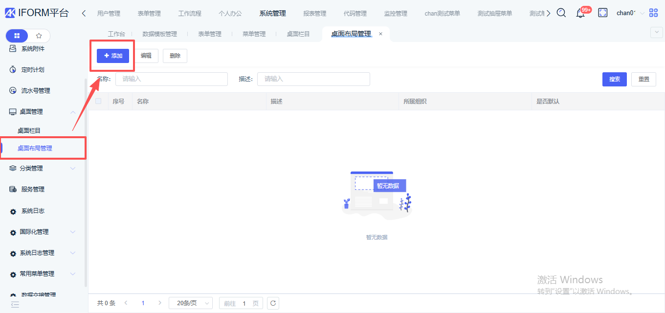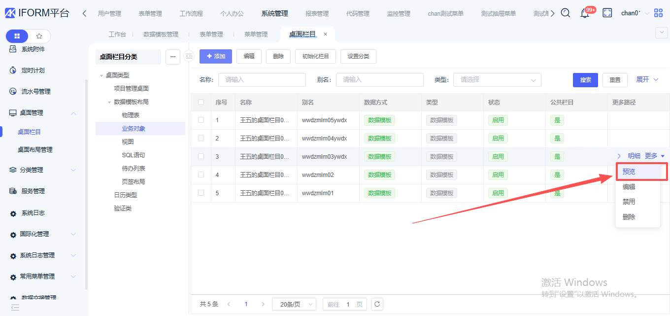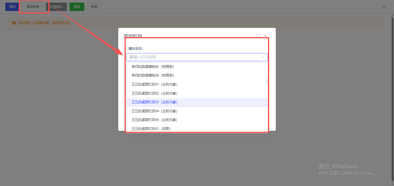 4、【桌面布局管理】添加栏目后保存,预览/点击工作台查看效果