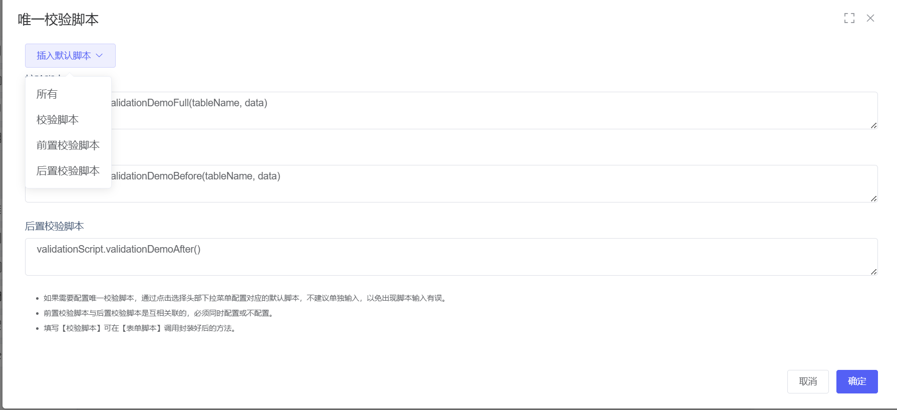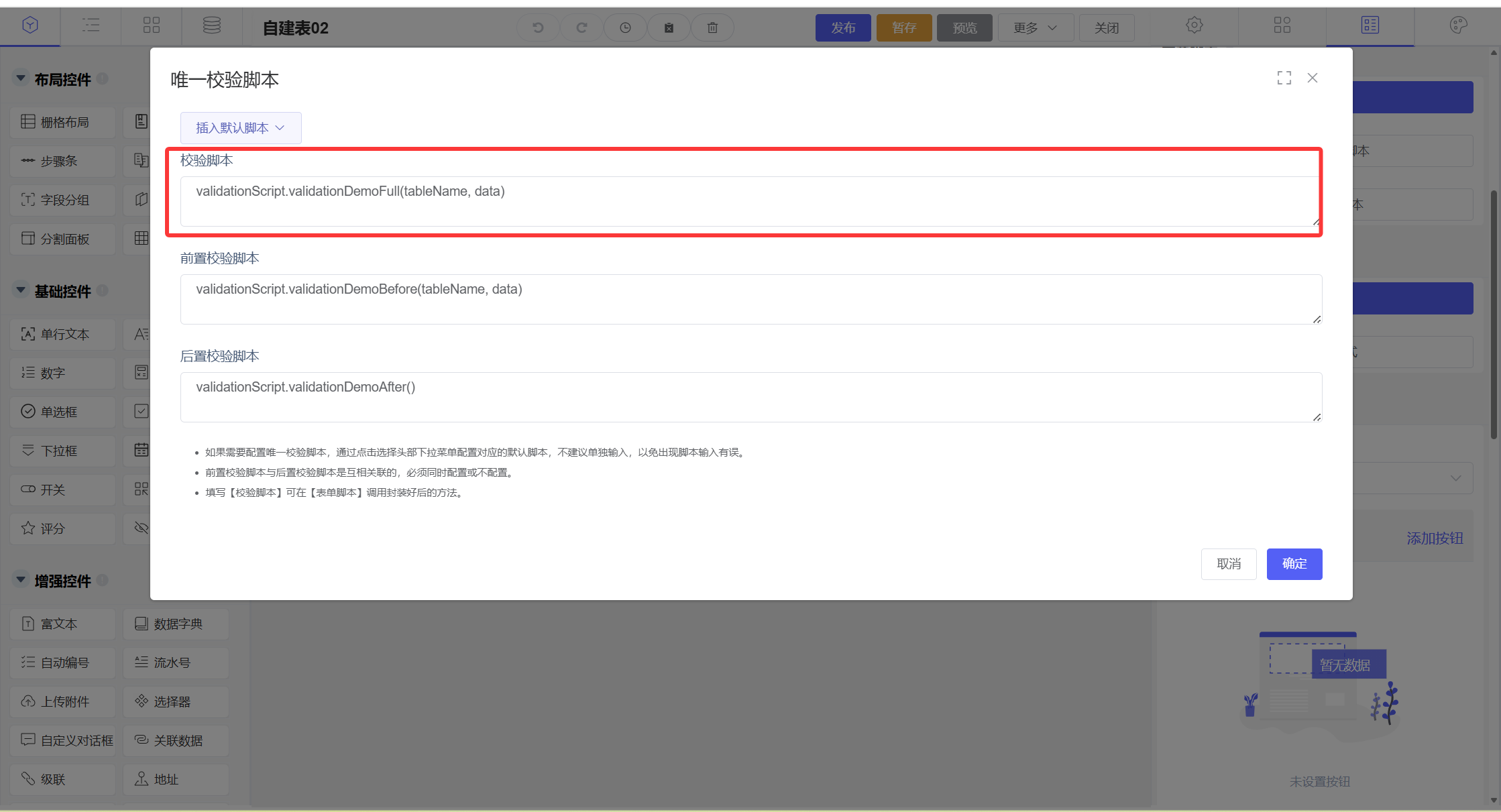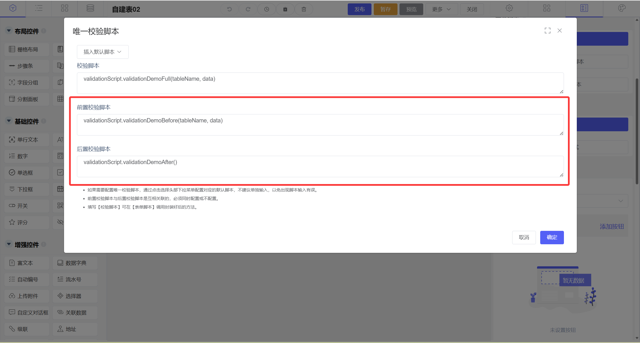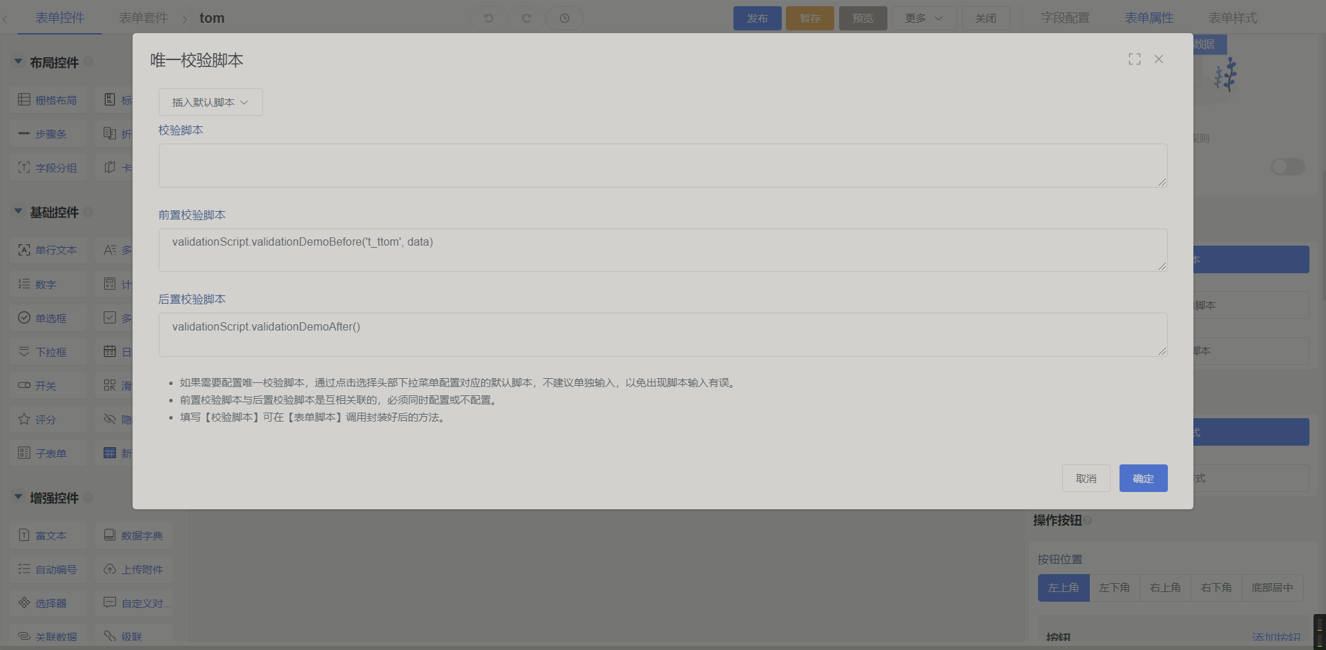 前置校验脚本与后置校验脚本是互相关联的,必须同时配置或不配置。配置后,表单提交时会自动执行脚本校验,否则不执行脚本校验。