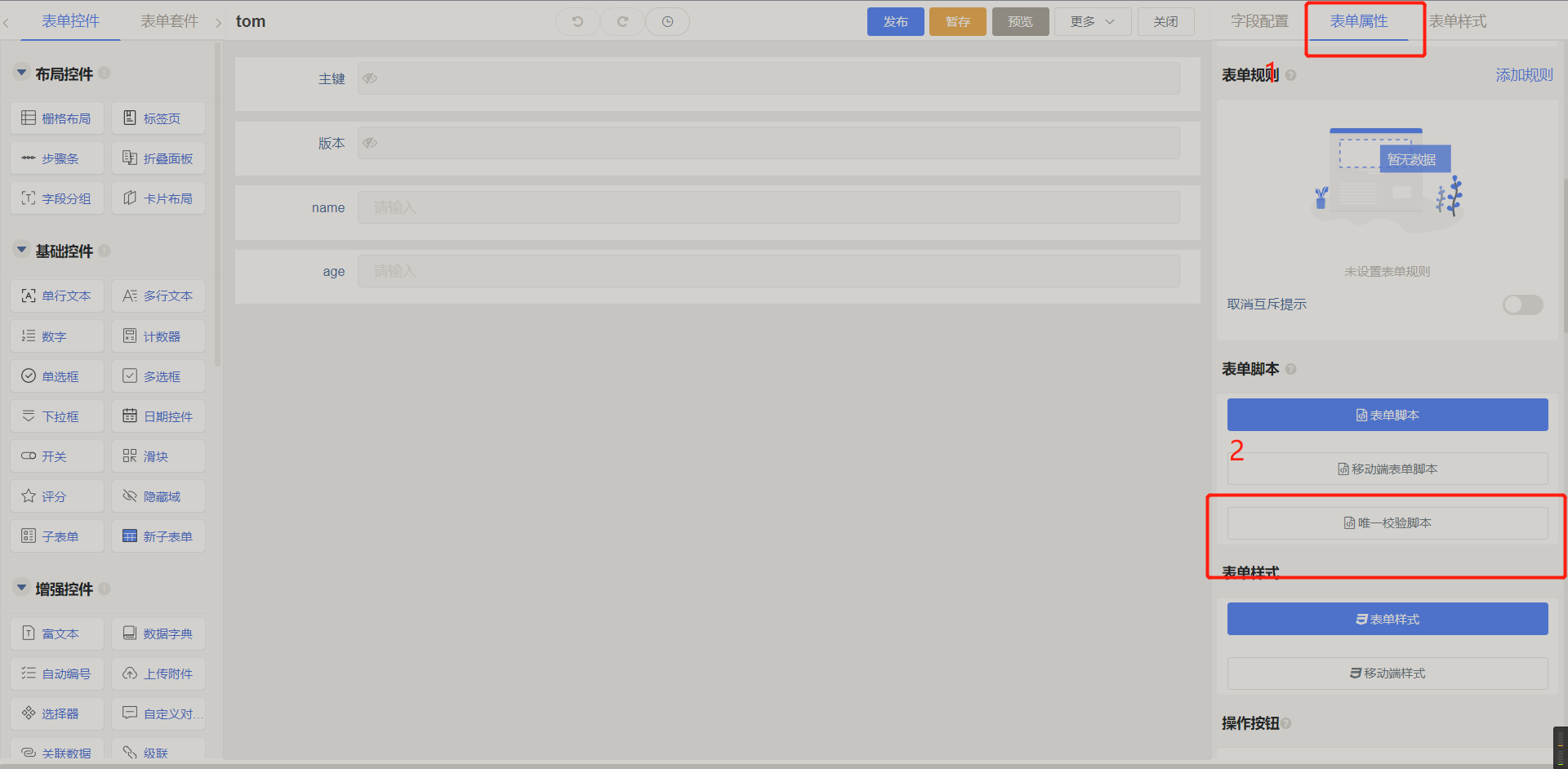 脚本可以通过左上方的下拉框选择后自动填入,自动填入后只需要手动修改下“tableName”,改成表单对应的表,也就是需要做唯一校验的那张表,用英文的单引号或者双引号括起来,例如: