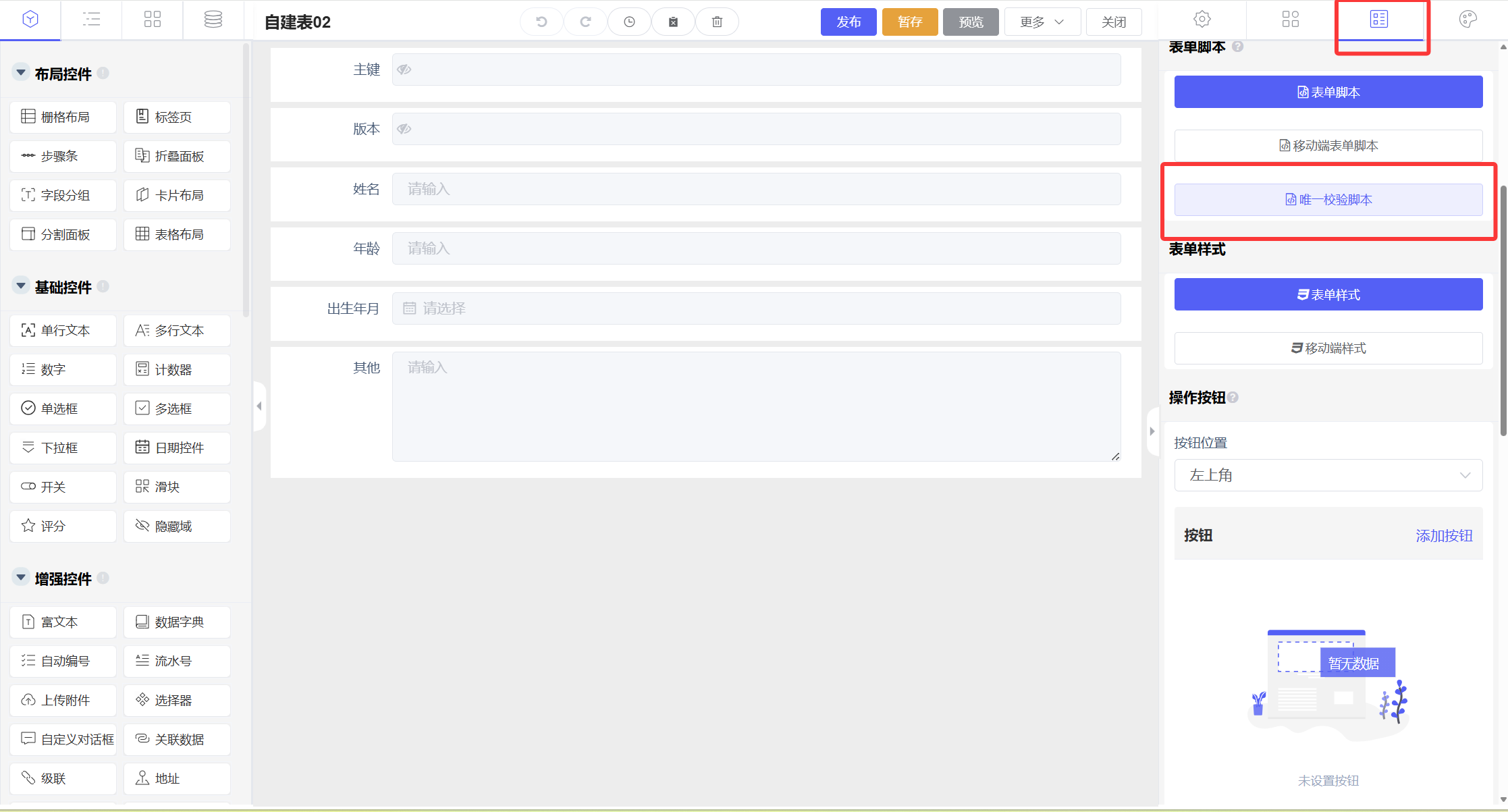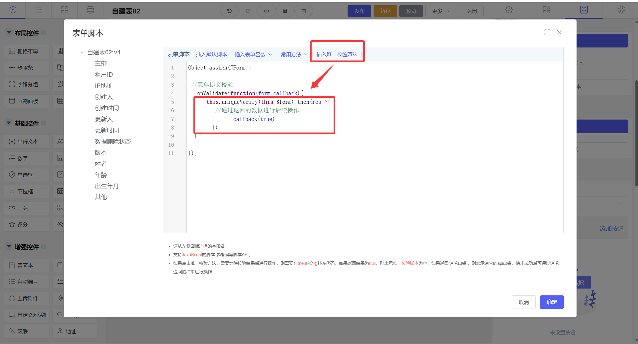 校验脚本配置后,还需要在表单脚本中插入唯一校验方法,该方法执行时会调用到校验脚本中配置的脚本,可在方法中通过返回的数据进行后续操作。